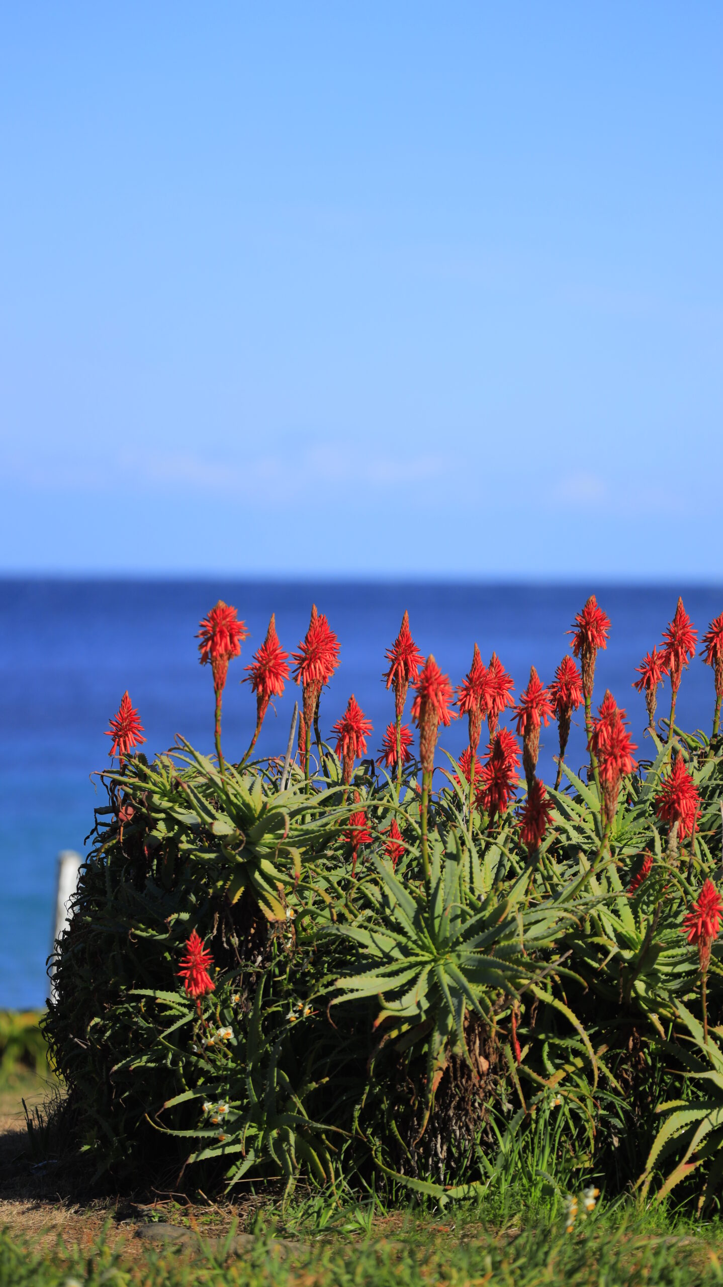 この写真は、爪木崎(下田)で、アロエの花と海と青空を撮影したものです。冬の伊豆らしい色の組み合わせです。