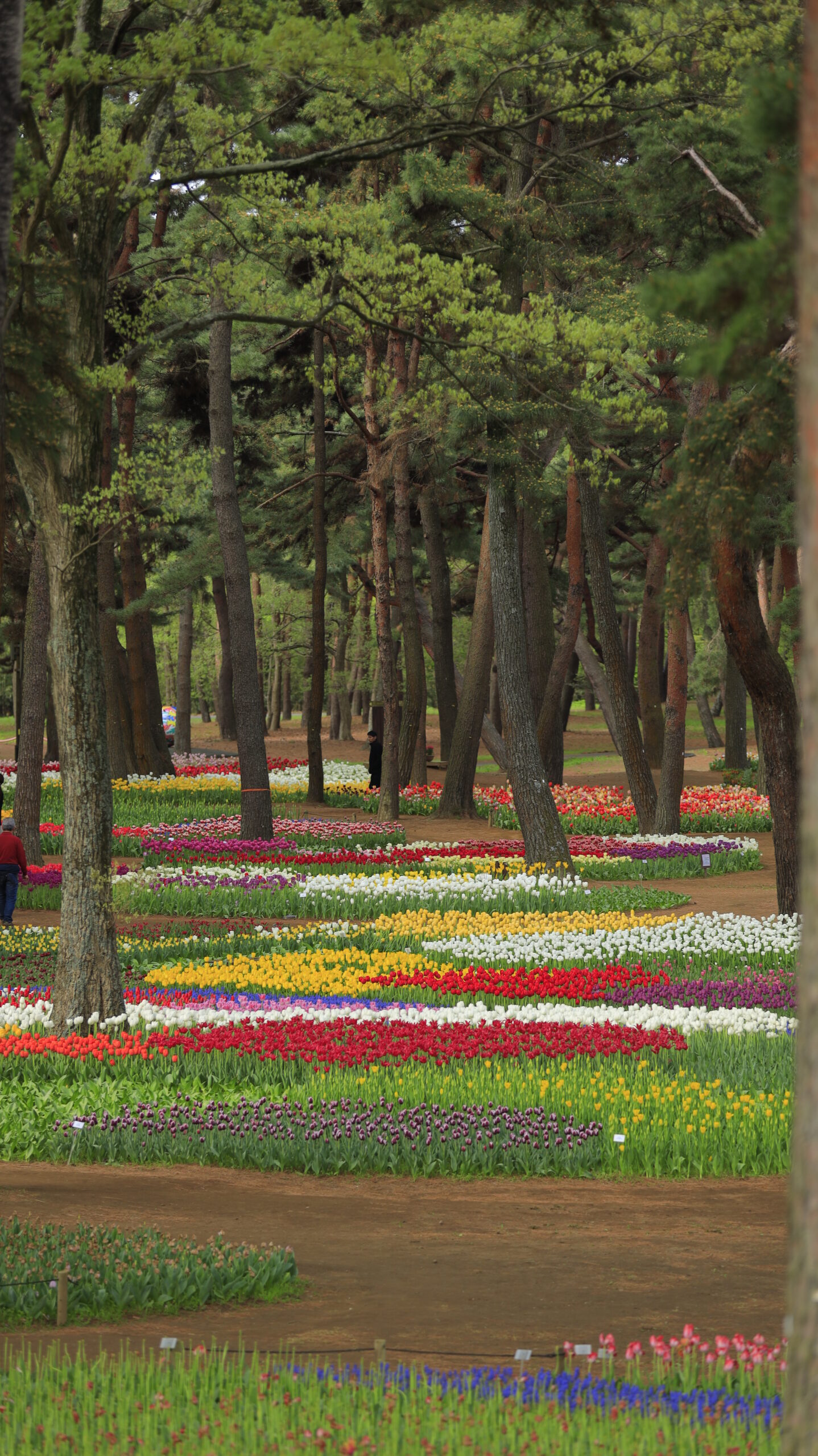 この写真は、国営ひたち海浜公園で、少し離れた高い位置からチューリップ畑を広く捉え、奥行きを意識した構図で撮影したものです。