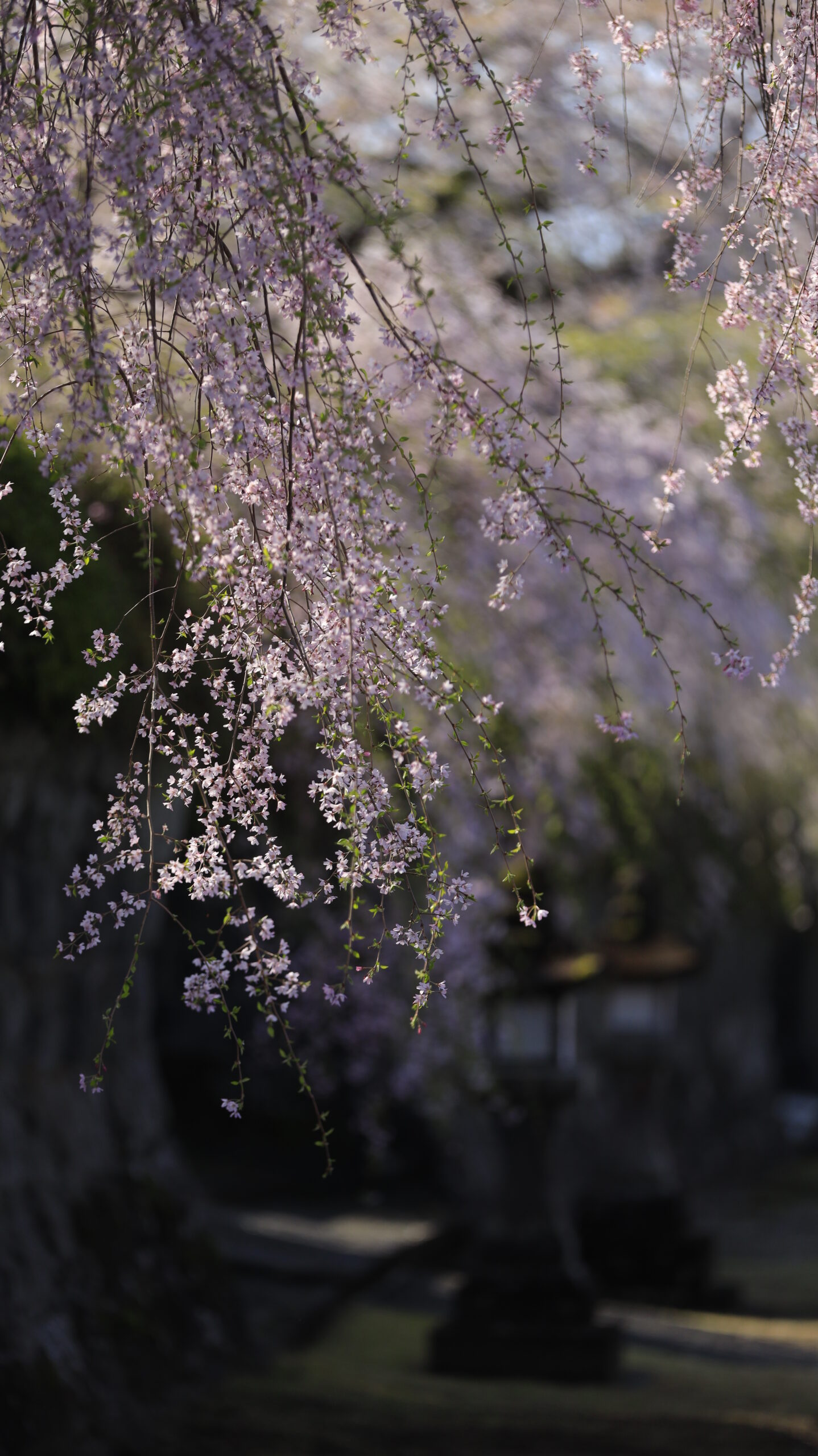 この写真は、大石寺で、影の中に差し込むわずかな光が枝垂れ桜を照らす印象的な瞬間を撮影したものです。