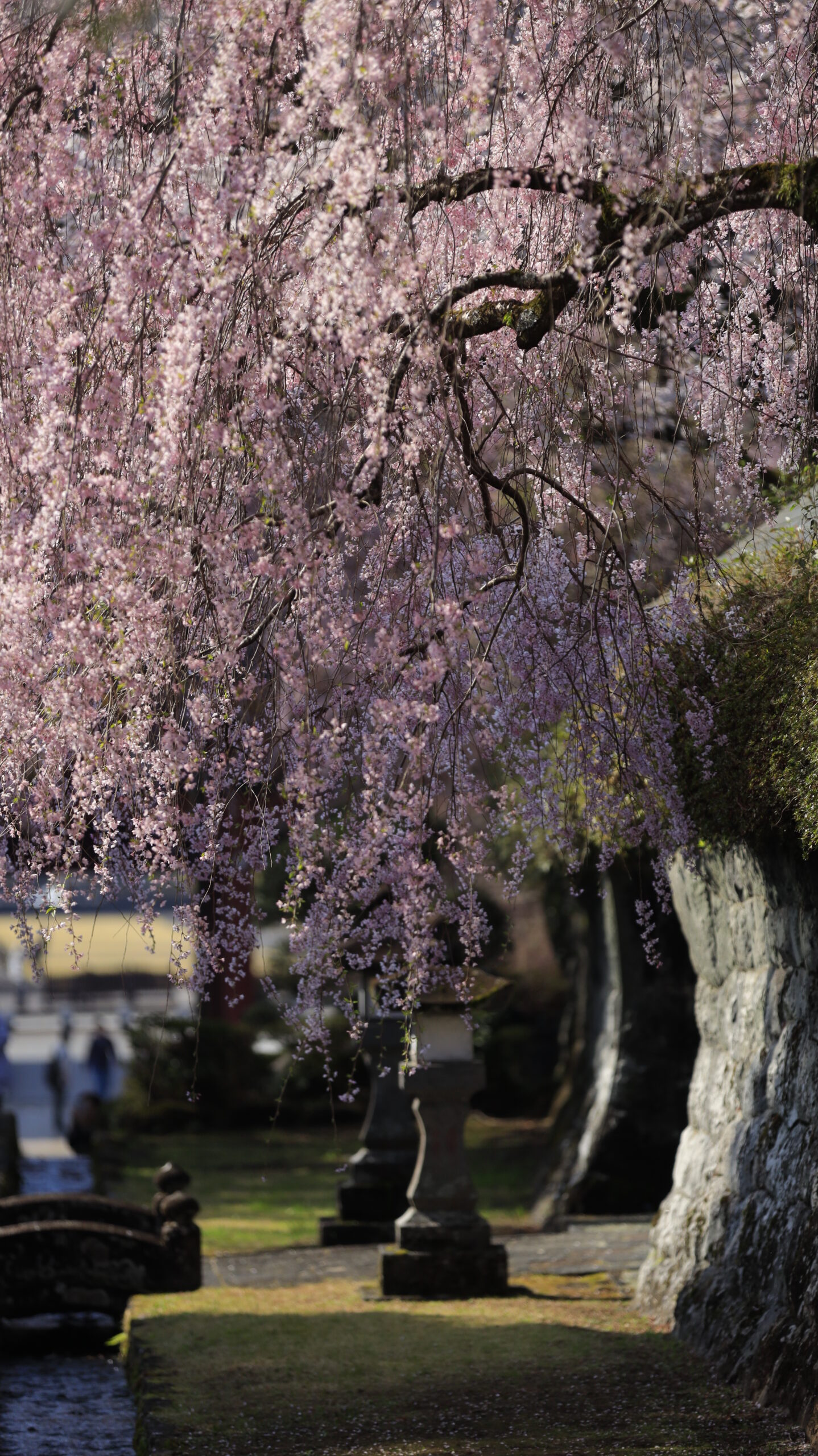 この写真は、大石寺で、参道入口付近の立派な枝垂れ桜を正面の門に向かって撮影したものです。