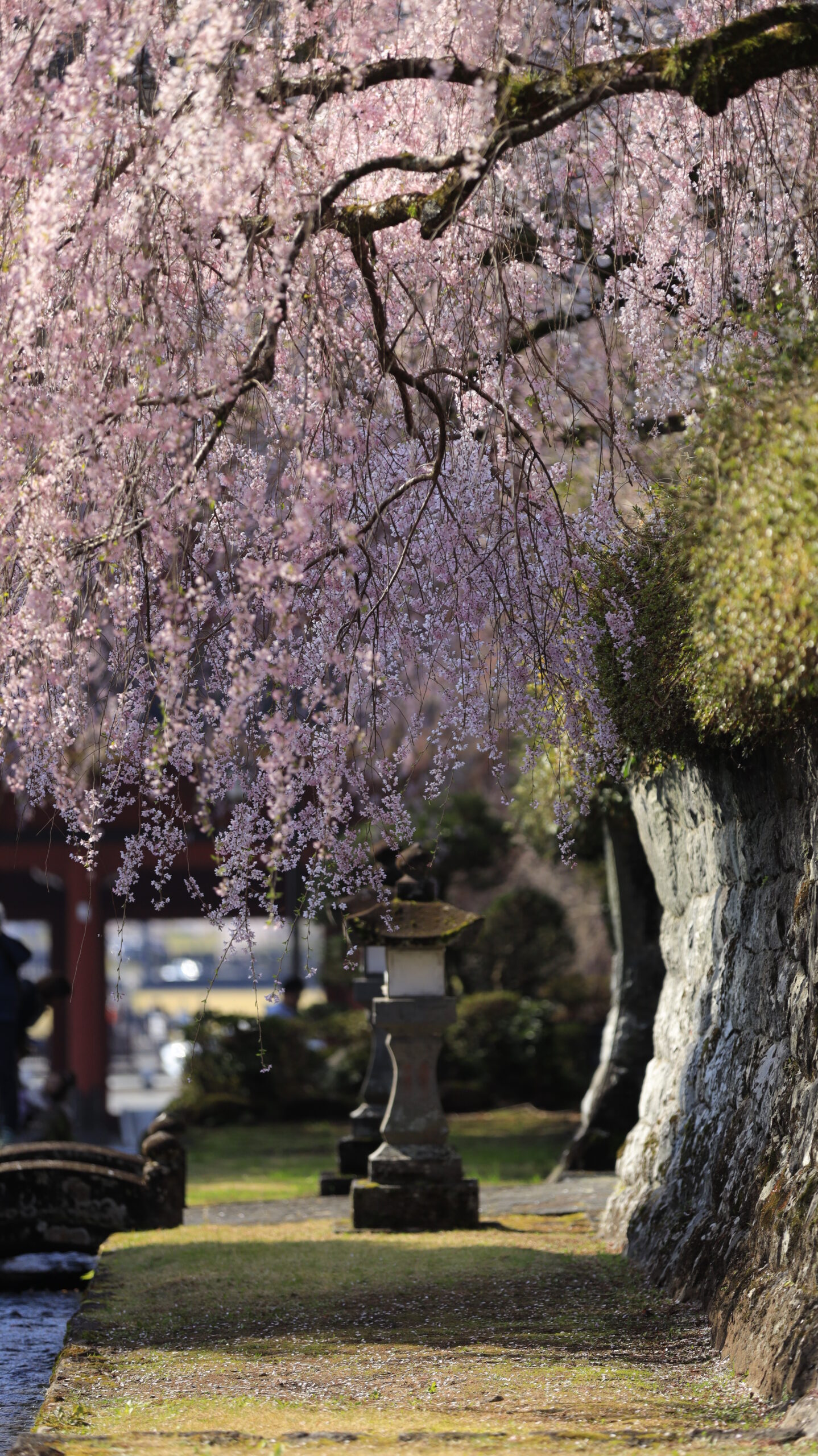 この写真は、大石寺で、坊の上から流れるように咲く枝垂れ桜と参道の様子を撮影したものです。