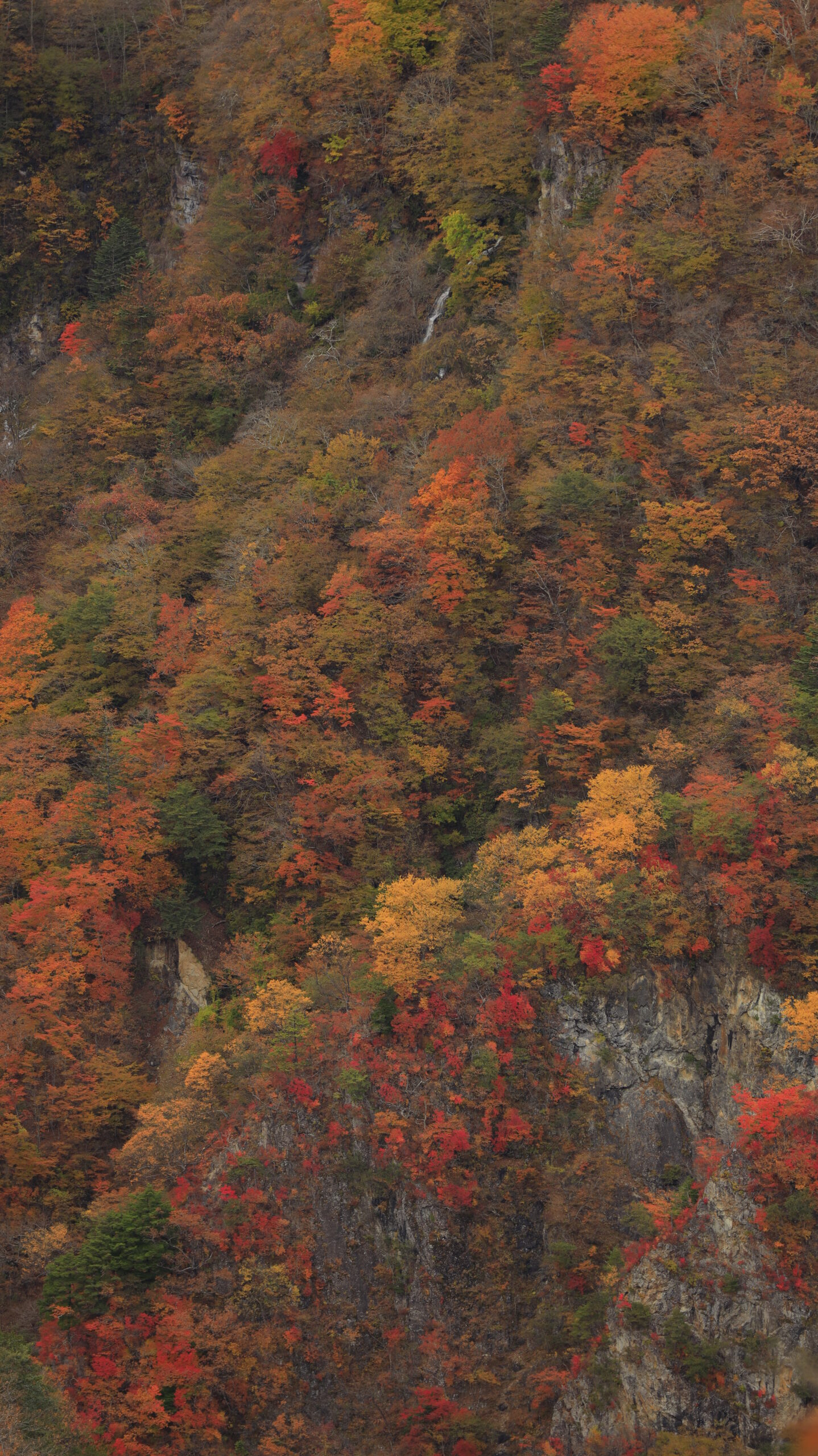 日光・明智平ロープウェイから紅葉に包まれた崖を撮影。赤や黄色のグラデーションが鮮やかな一枚。