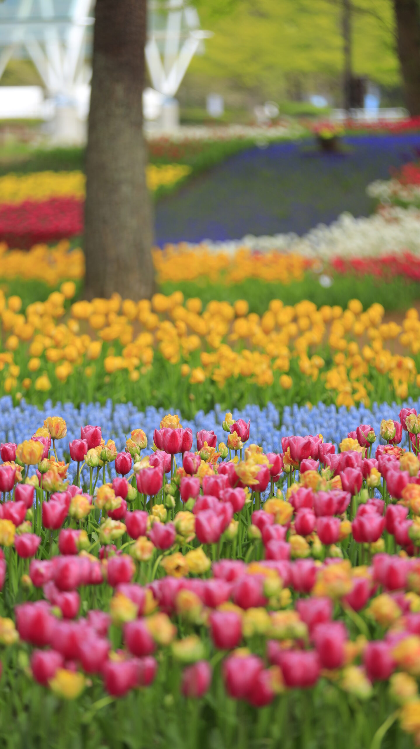 この写真は、国営ひたち海浜公園で、ピンクのチューリップにピントを合わせ、周囲のカラフルな花々との対比で華やかさを表現したものです。