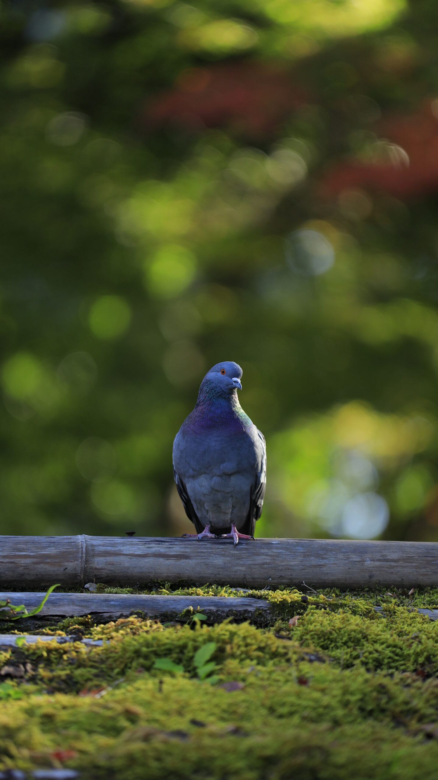 この写真は、ホテルニューオータニで、鳩がわずかに右を向く様子を、緑の玉ボケを背景に撮影したものです。柔らかな光と背景のボケが美しく、自然の優しい雰囲気が感じられる一枚です。