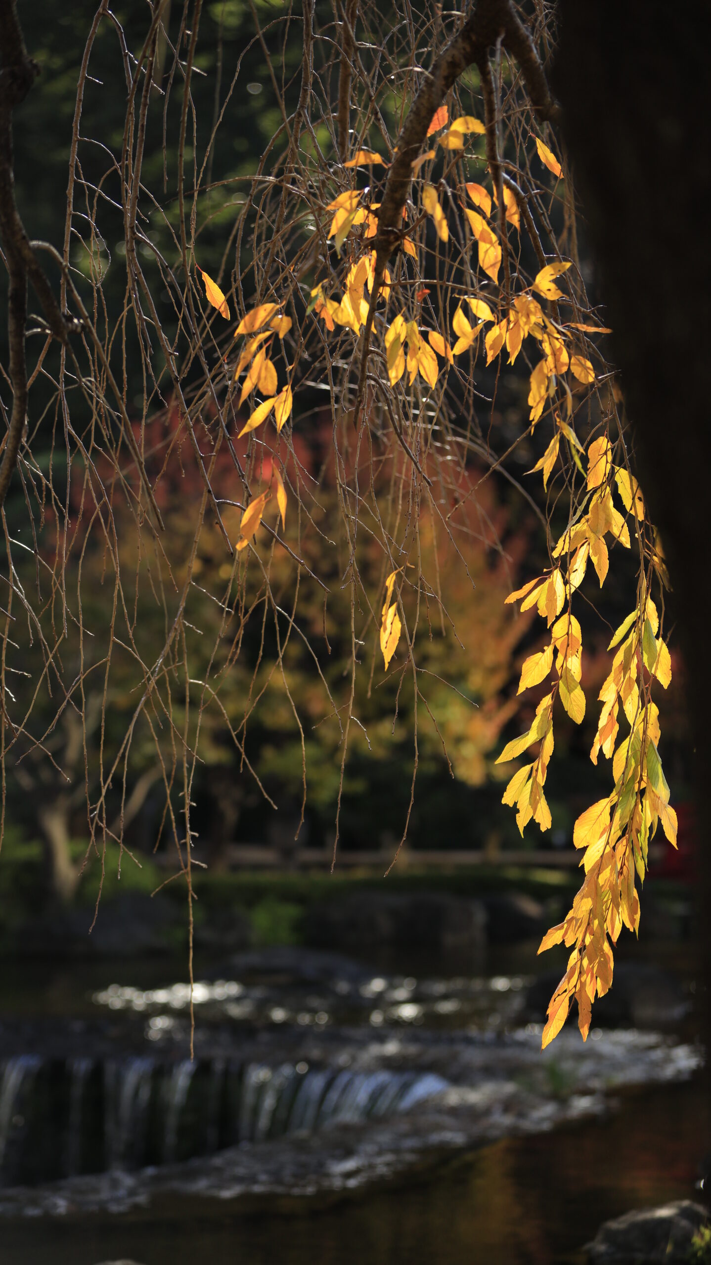 この写真は、ホテルニューオータニで、池の周りの枝垂れ桜の葉が紅葉し、光に照らされる様子を撮影したものです。繊細な葉の表情が光により際立ち、柔らかく美しい秋の景色となっています。