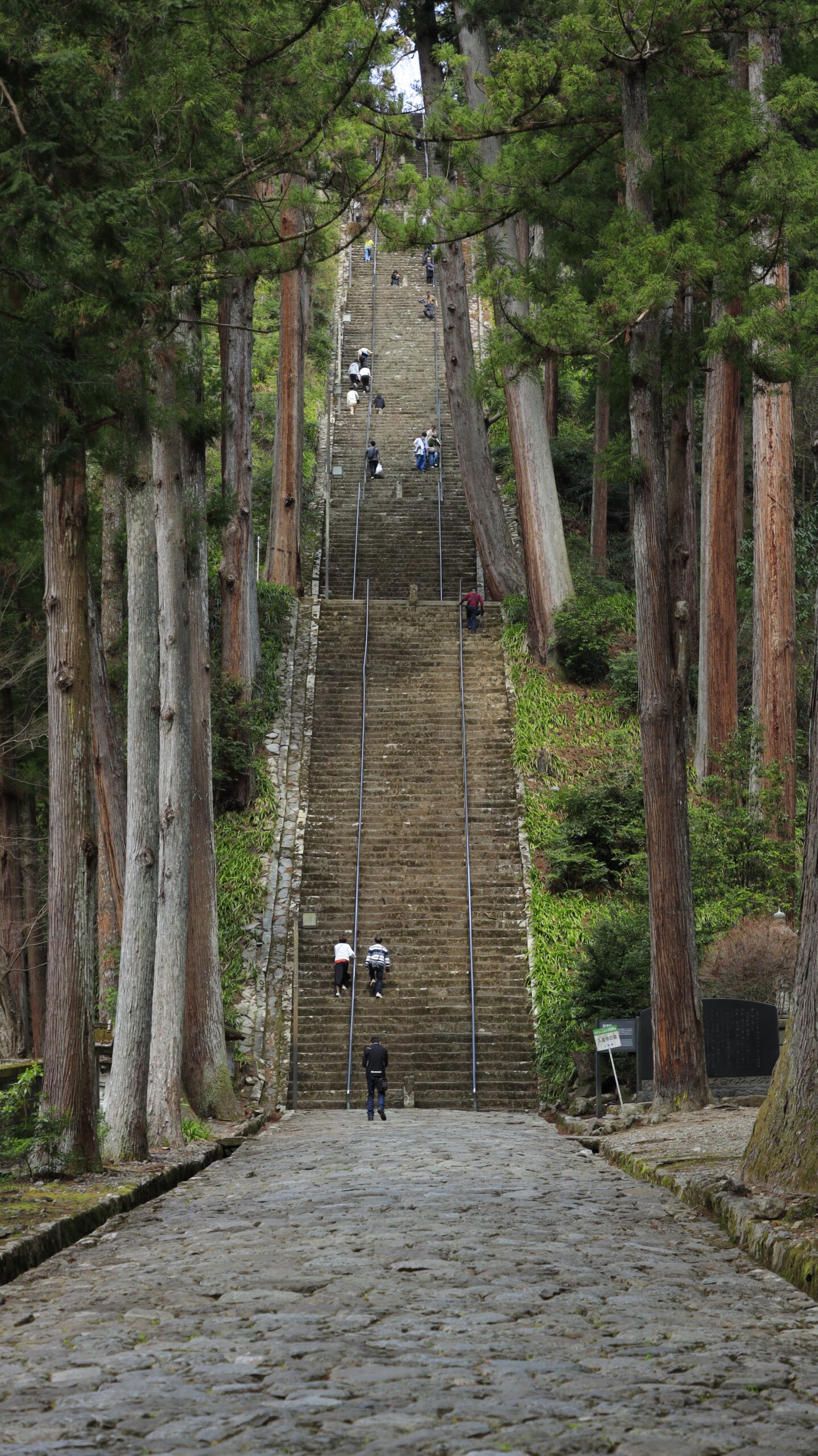 この写真は、身延山久遠寺で、どこまでも続くような急こう配の階段を印象的に撮影したものです。