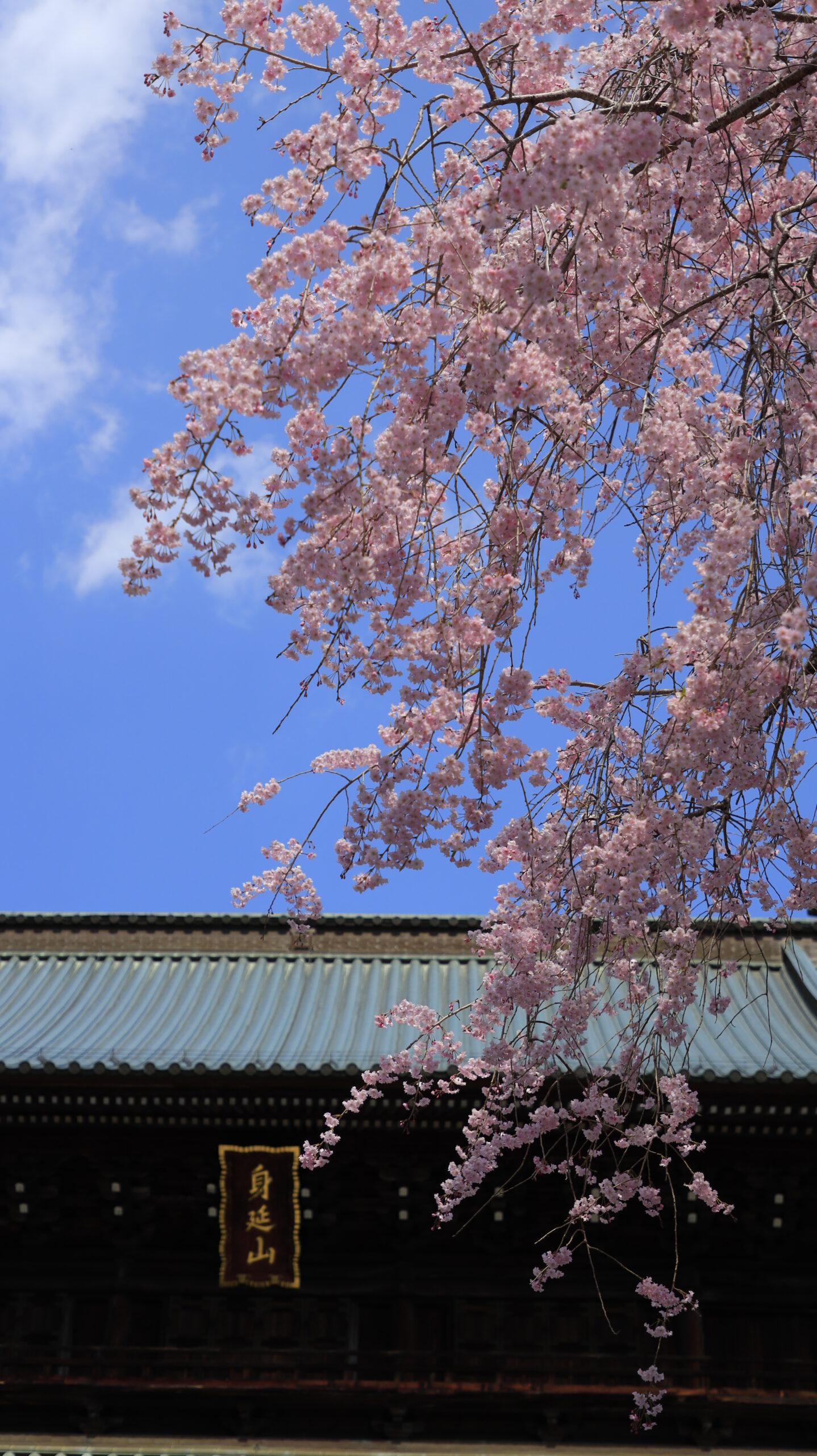 この写真は、身延山久遠寺で、階段下の門付近で美しい枝垂れ桜と身延山の看板を一緒に撮影したものです。