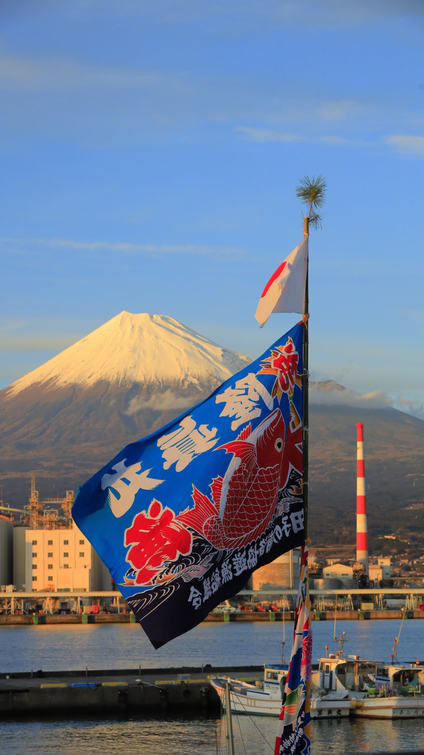 この写真は、田子の浦で、1月1日の大漁旗漁船パレードの前日に、大漁旗にピントをあわせて富士山と撮影したものです。旗の存在感を優先しています。
