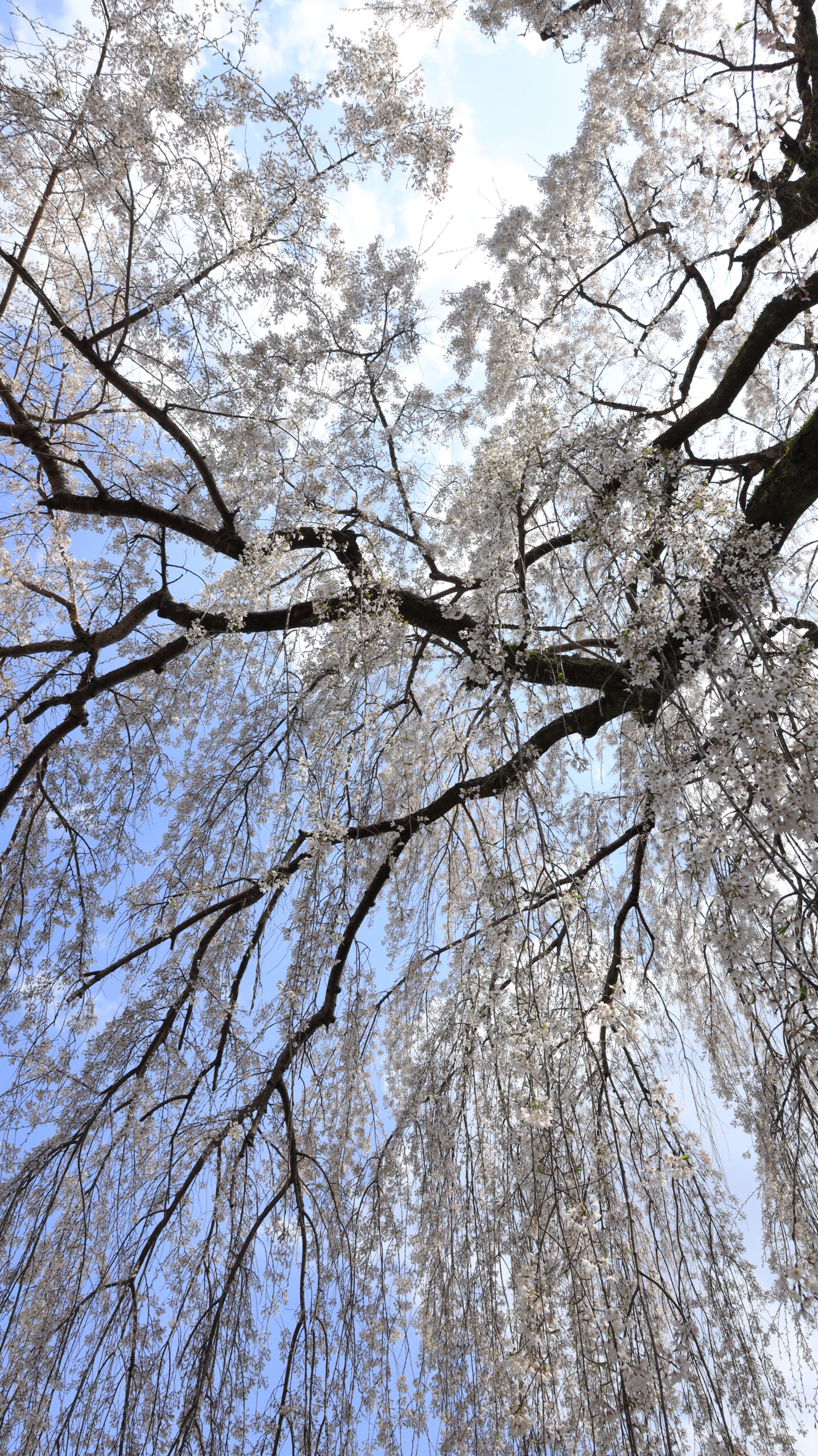 この写真は、身延山久遠寺で、美しい枝垂れ桜を下から見上げる形で広角モードを使って撮影したものです。