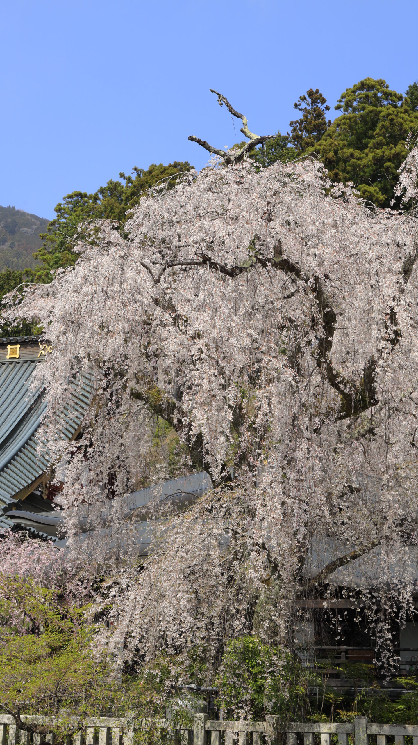 この写真は、身延山久遠寺で、少し離れた位置から立派な枝垂れ桜とお寺の建物をバランスよく撮影したものです。