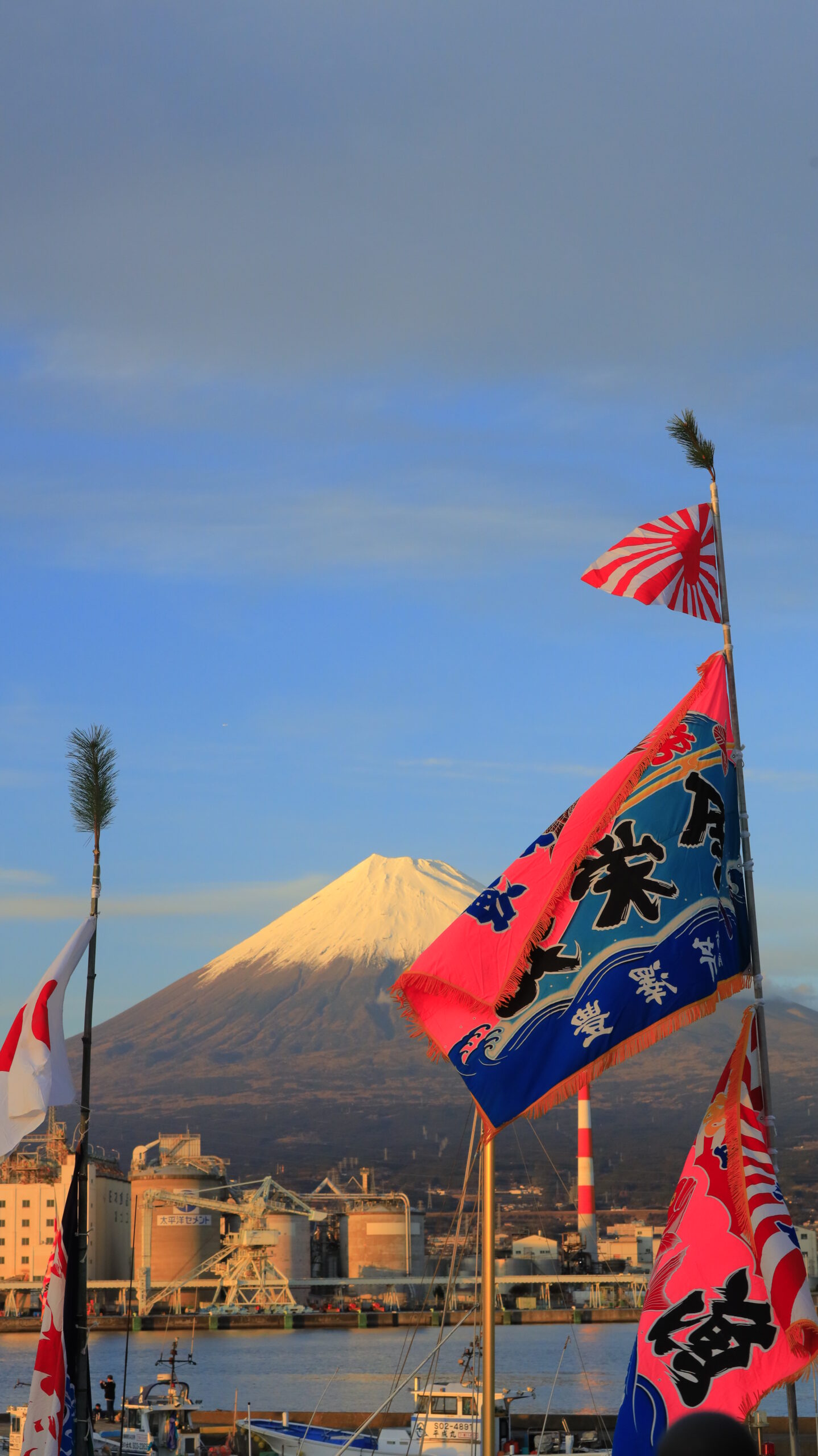 この写真は、田子の浦で、1月1日の大漁旗漁船パレードの前日に、大漁旗と富士山を少し引き気味で撮影したものです。周囲の空気感も入れています。