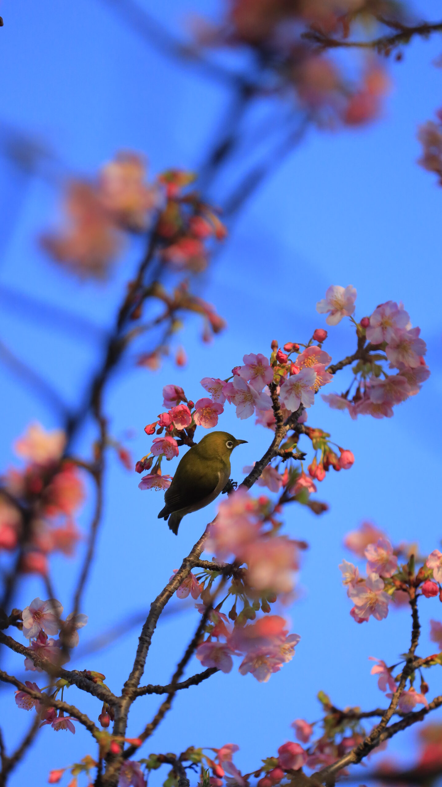 この写真は、汐入公園で、咲きたての美しい河津桜と後ろ姿のメジロを撮影し、穏やかな春のワンシーンを表現しています。