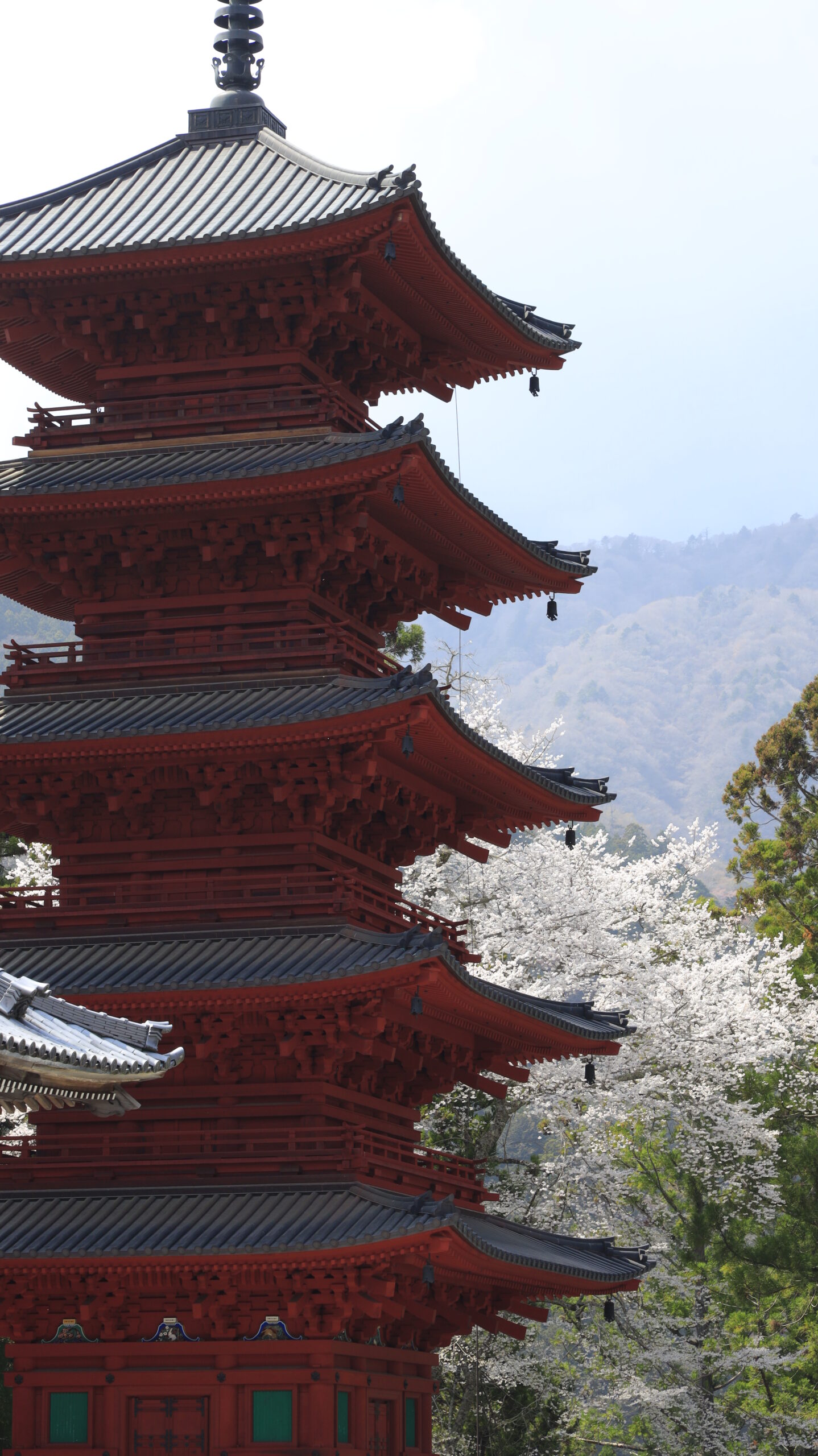 この写真は、身延山久遠寺で、大きな五重塔とその奥に咲く桜の様子を撮影したものです。