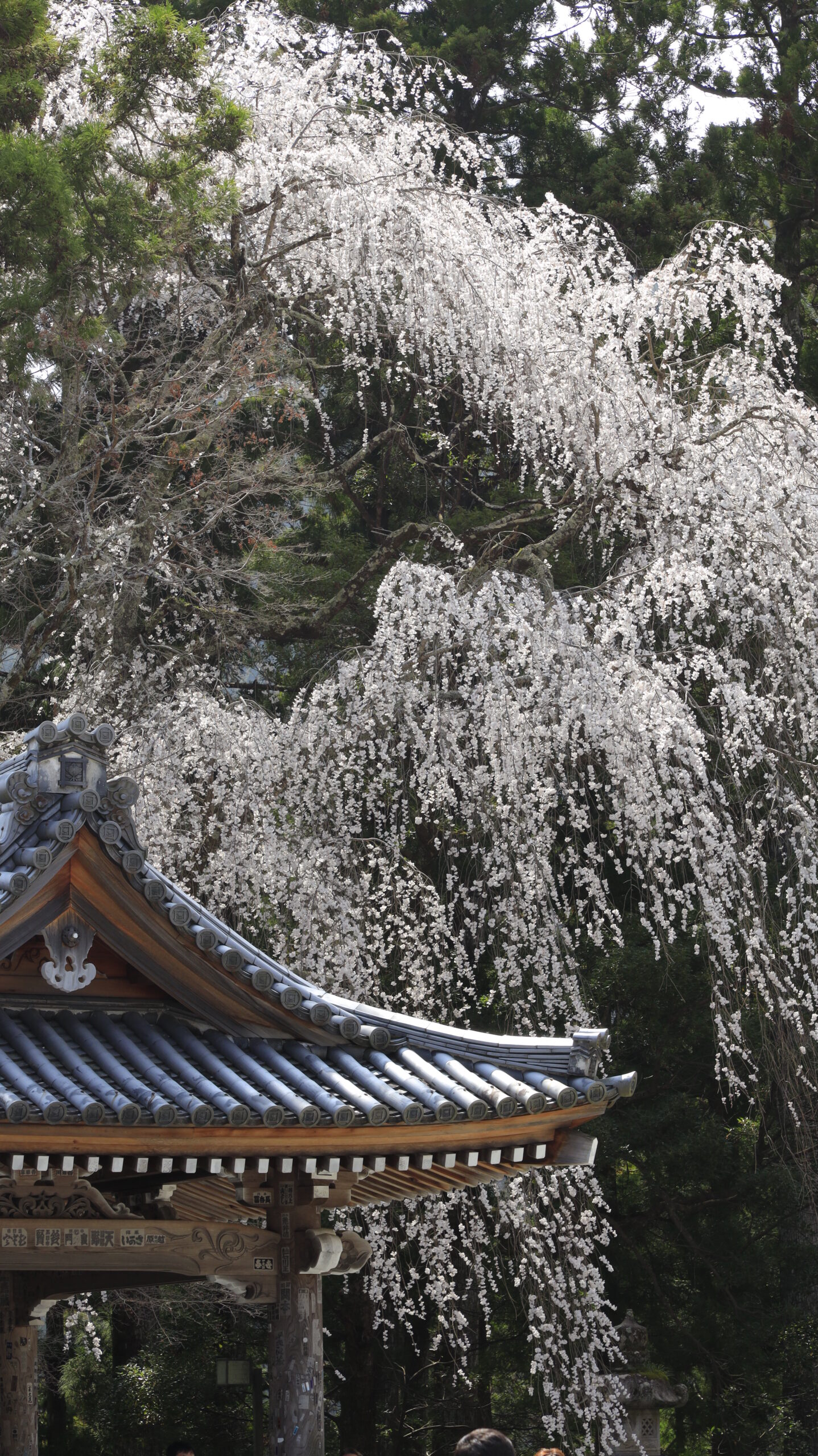 この写真は、身延山久遠寺で、お寺の建物と真っ白な枝垂れ桜を組み合わせて撮影したものです。
