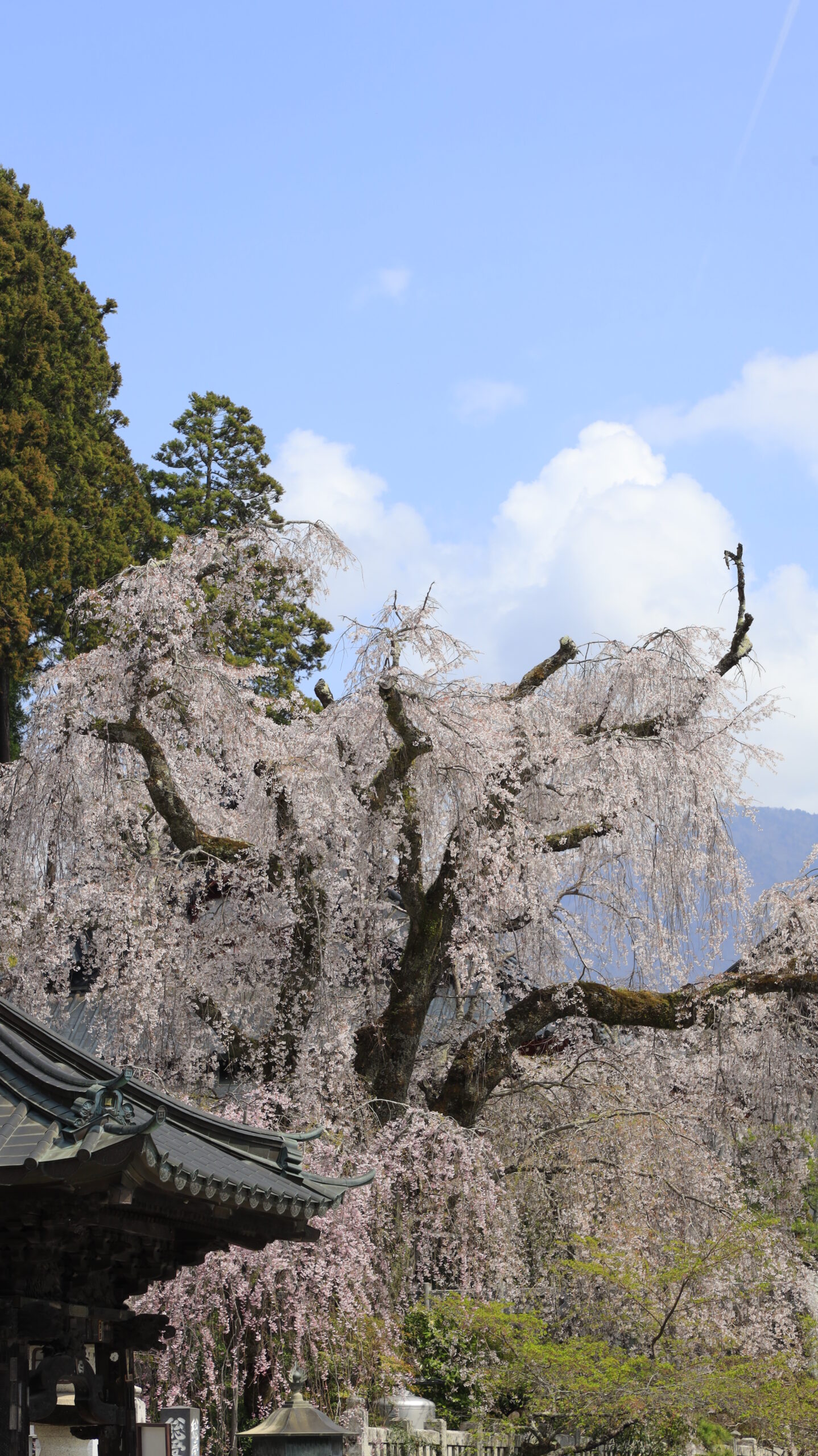 この写真は、身延山久遠寺で、シンボル的な大きな枝垂れ桜を少し離れた位置から撮影したもので、その圧倒的なスケールと美しさを全体的に表現した一枚です。