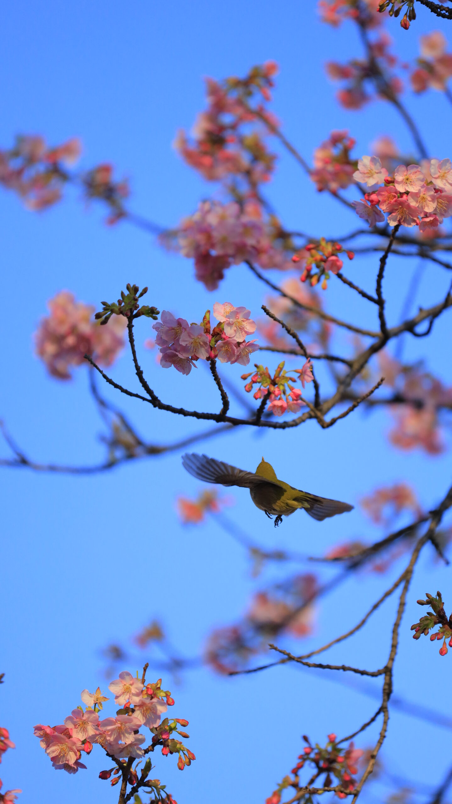 汐入公園で、河津桜へ向かって飛ぶメジロの躍動感を写した春のワンシーン