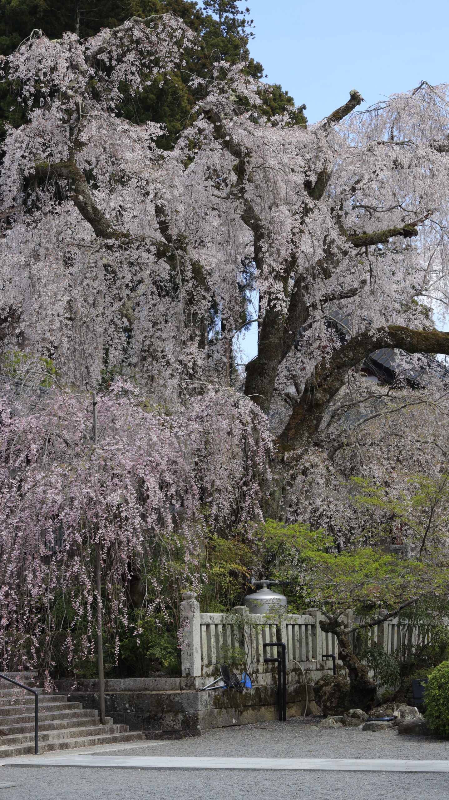 この写真は、身延山久遠寺で、少し暗めの露出ながらも大きな枝垂れ桜全体がしっかり映るように撮影したもので、落ち着いた雰囲気が印象的な一枚です。