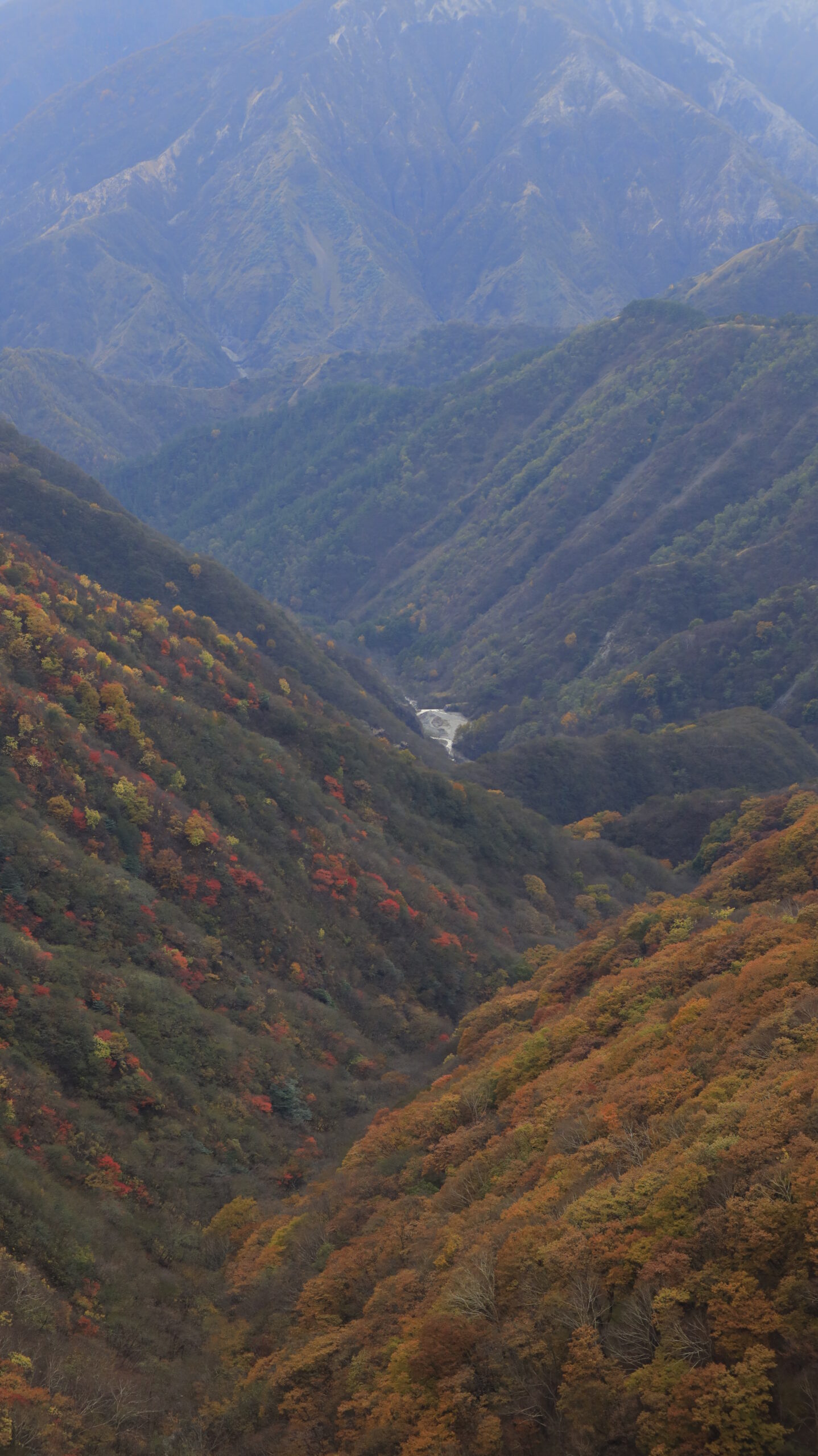 この写真は、半月山展望台の駐車場から、山と谷が織りなす紅葉の美しい風景を撮影したものです。自然の奥行きを感じる一枚です。