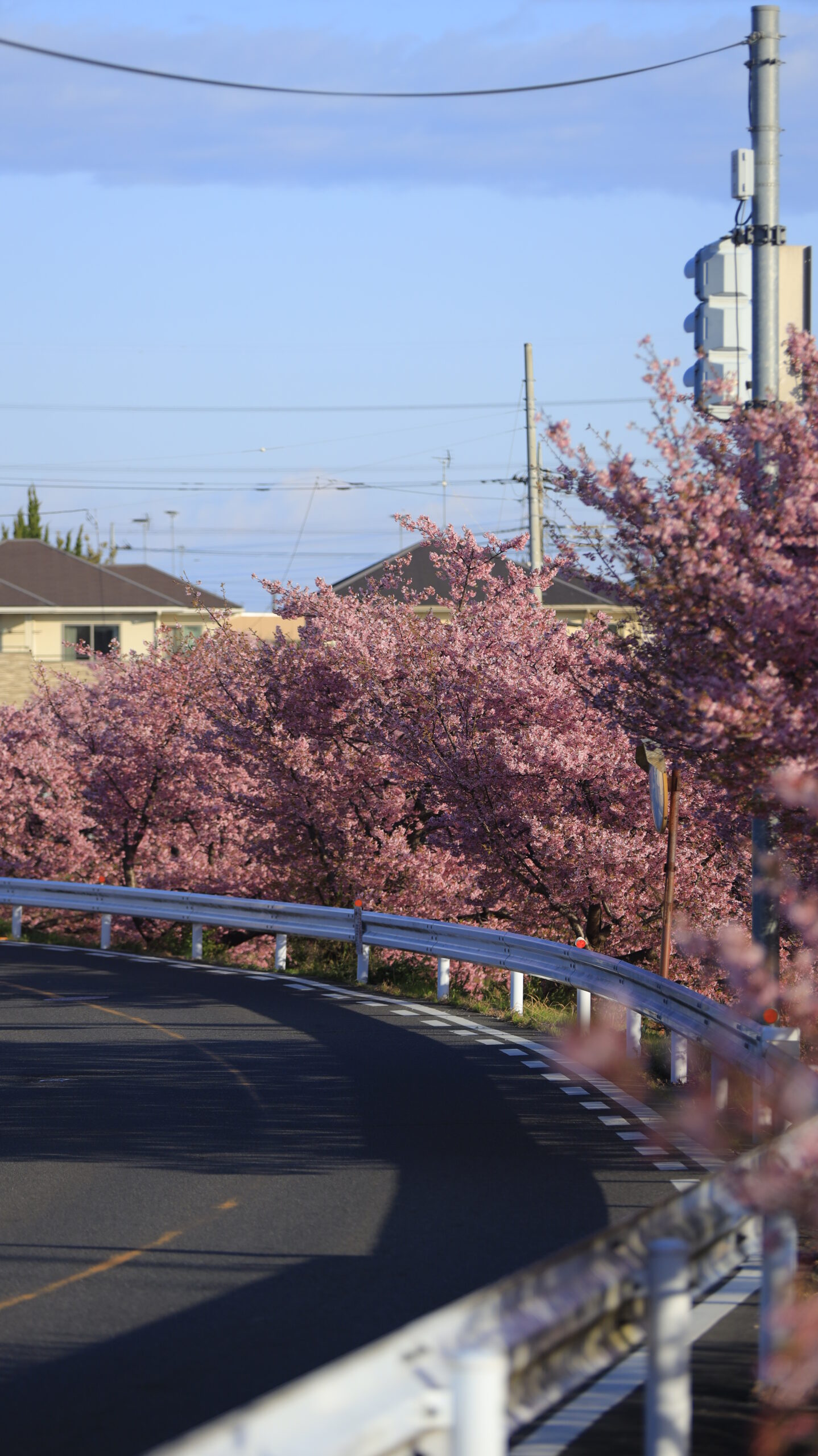 この写真は、青毛堀川で、道路のカーブとそこに沿って並ぶ河津桜の景色を写し込み、道の流れと桜並木の美しさを表現したものです。