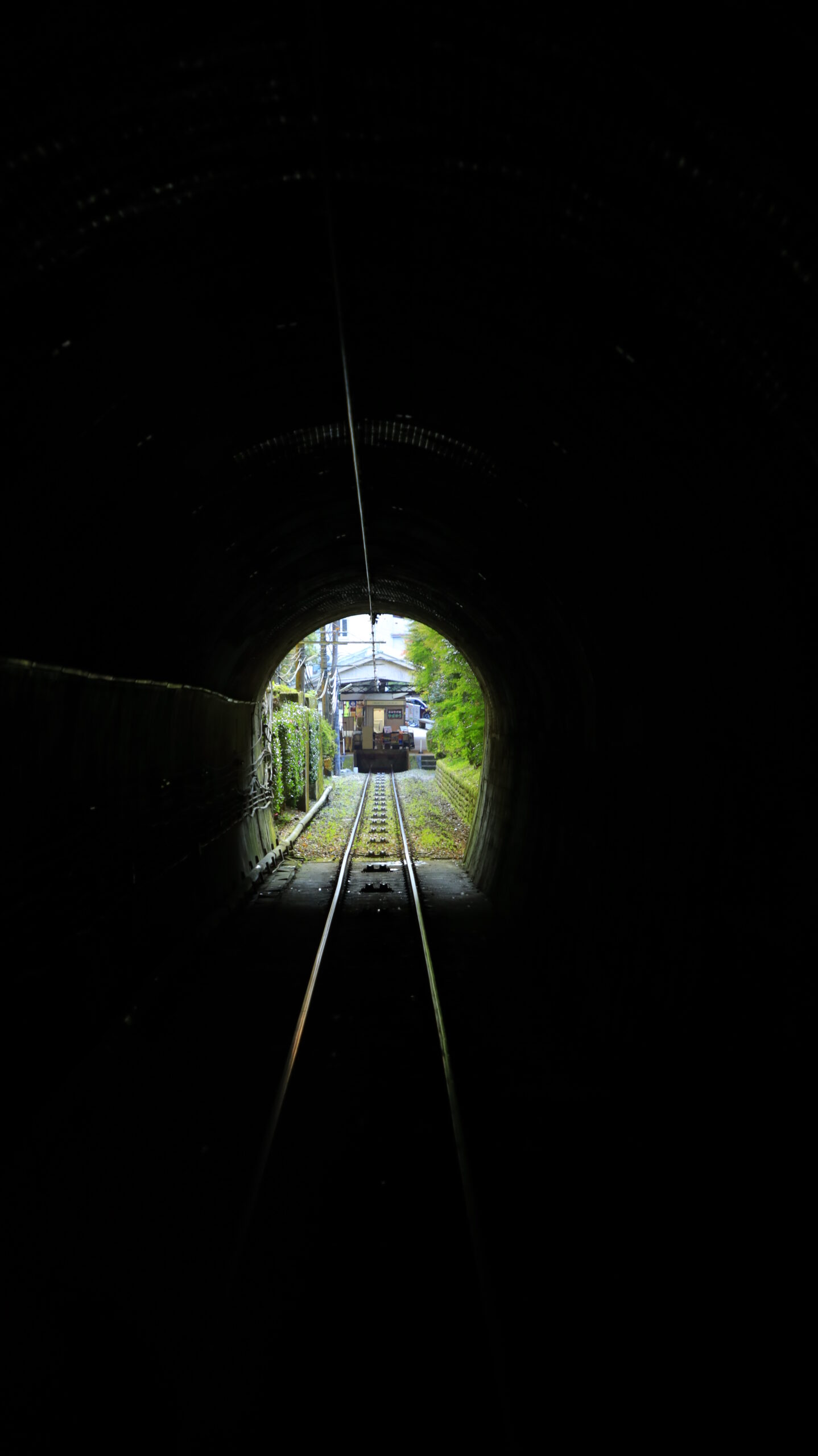 この写真は、高尾山のケーブルカーがトンネルを登る際に、下の方を見下ろすようにして撮影したもので、紅葉に包まれた斜面の美しさを感じられる構図です。