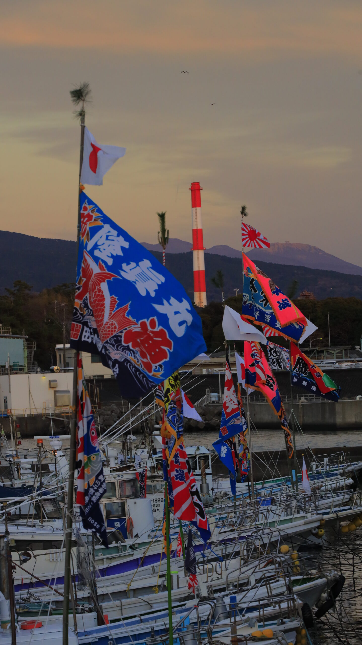 この写真は、田子の浦で、1月1日の大漁旗漁船パレードの前日に、日が暮れてくる段階で、たくさんの船の大漁旗を撮影したものです。夕方の空気感が出る時間帯です。