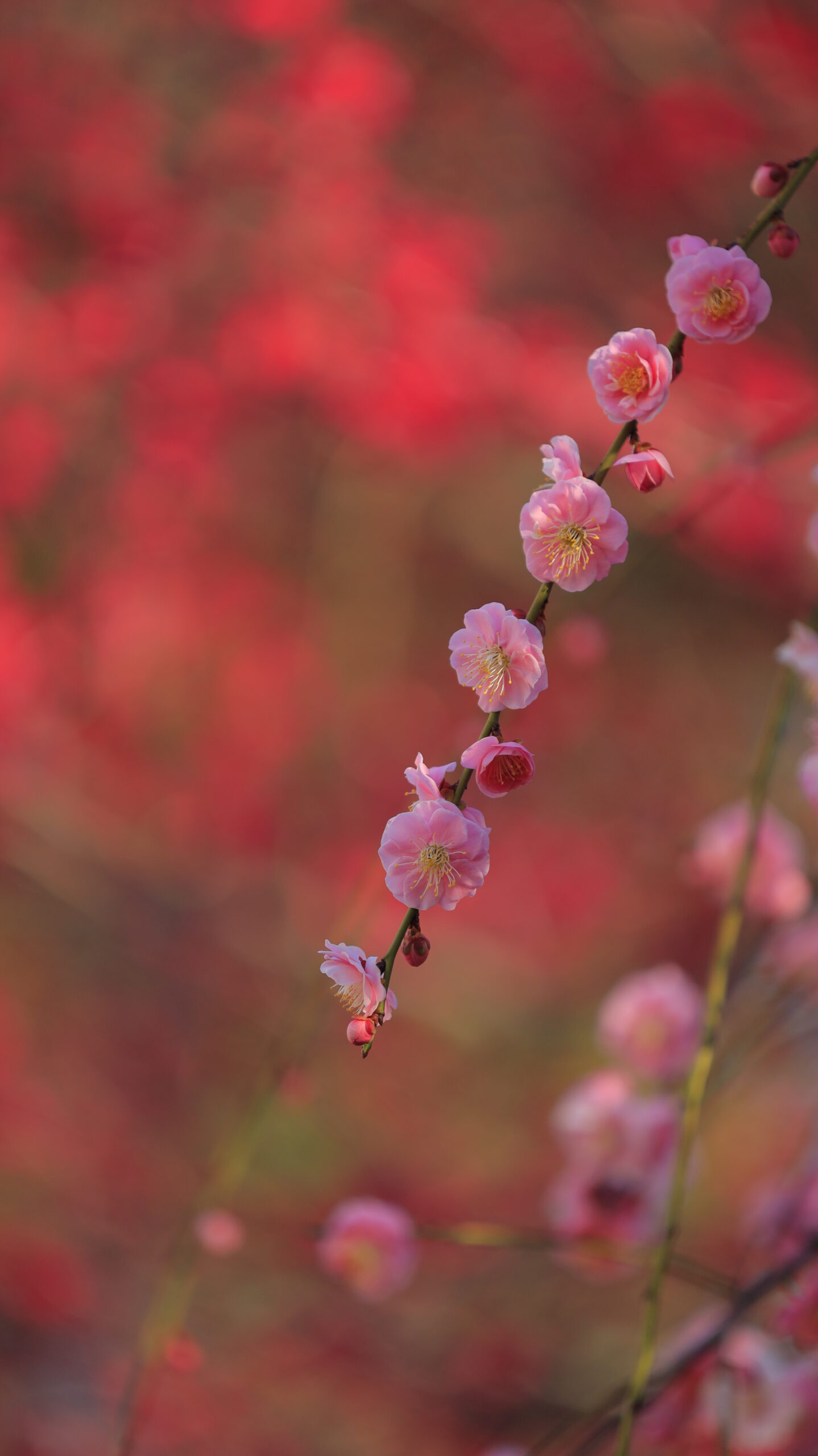 この写真は、亀戸天神で、赤い梅を背景に淡いピンクの枝垂れ梅の枝を撮影し、色の対比と枝ぶりの美しさを意識しました。