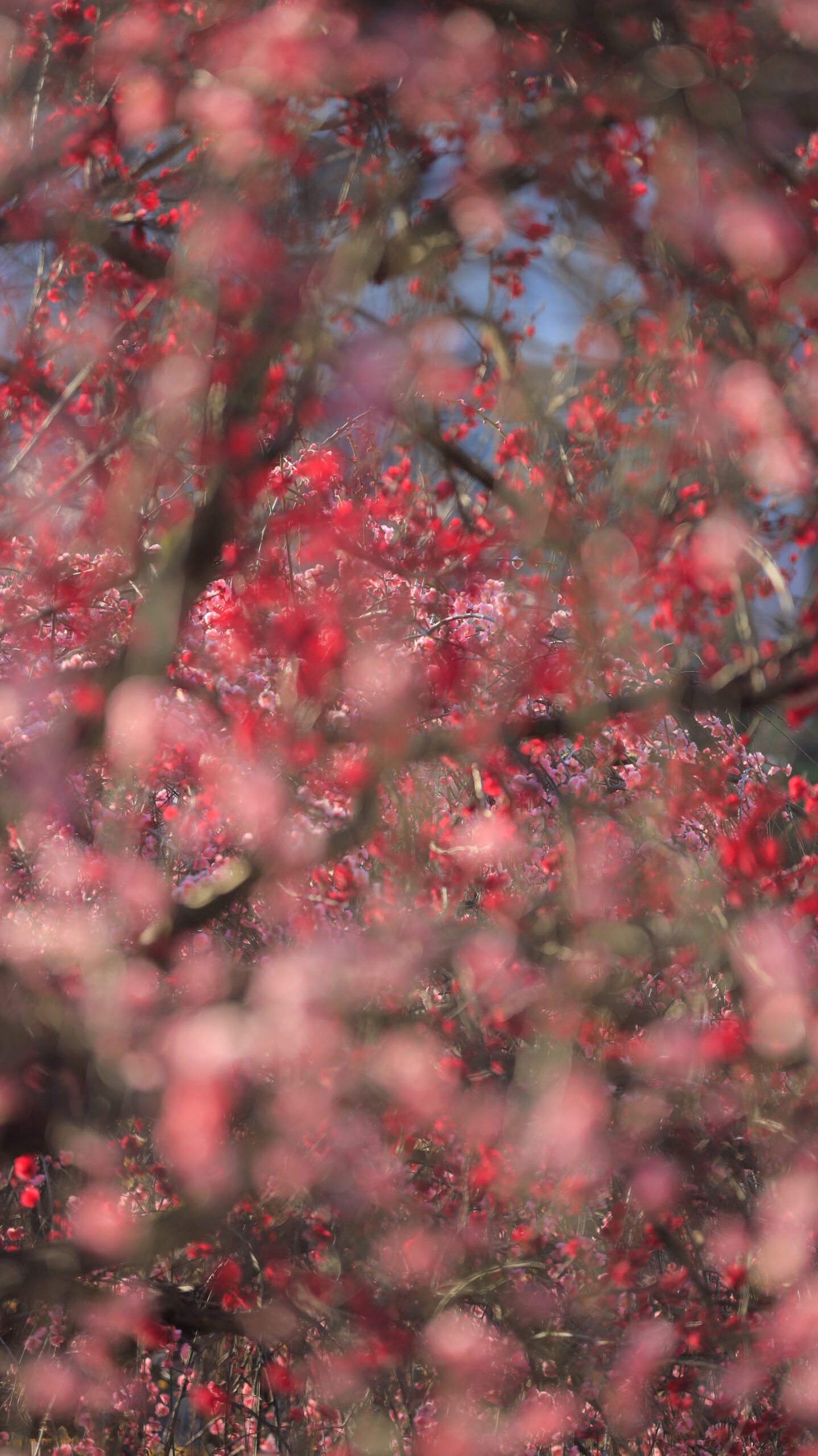 この写真は、亀戸天神で、枝垂れ梅の間から赤や淡いピンクの梅を楽しめるよう色のグラデーションを意識して撮影したものです。