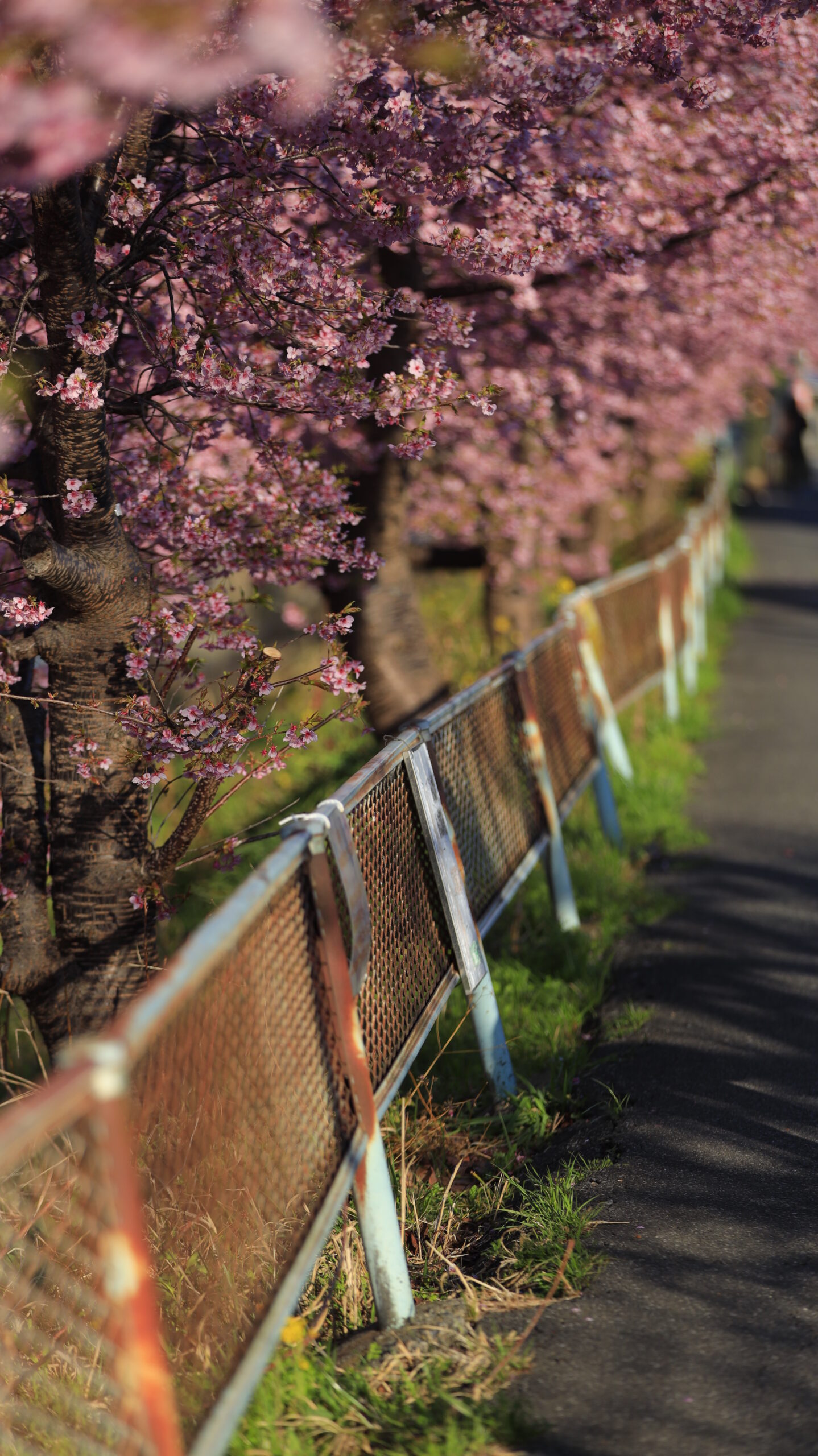 この写真は、青毛堀川で、河津桜並木とその下にあるフェンスに注目し、町の風景の中の桜を表現して撮影したものです。