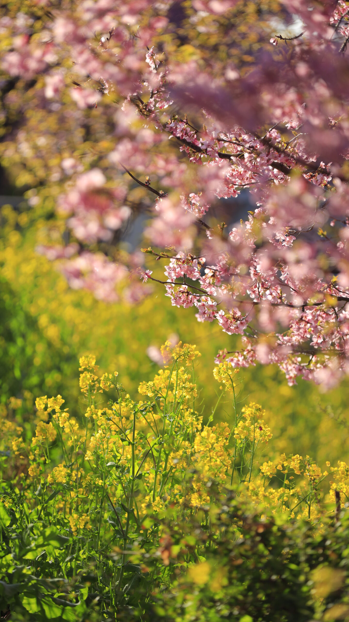 この写真は、青毛堀川で、キラキラと光る菜の花と河津桜の組み合わせを撮影し、春の色彩を感じられる一枚です。