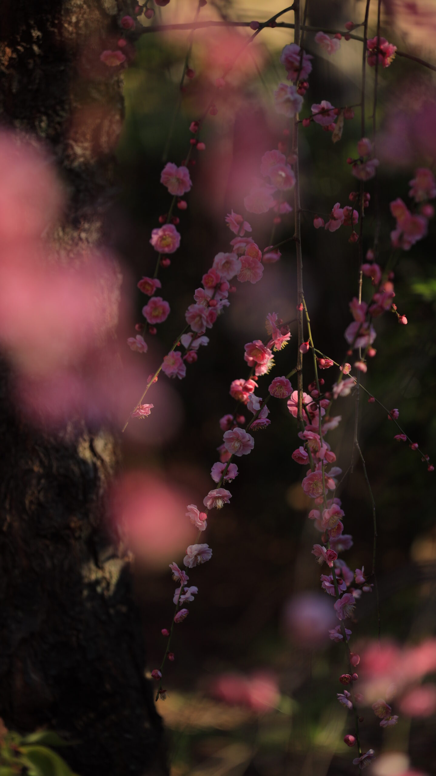 この写真は、亀戸天神で、背景を暗めに落とし光が当たる梅の枝を撮影し、花の輪郭を際立たせています。