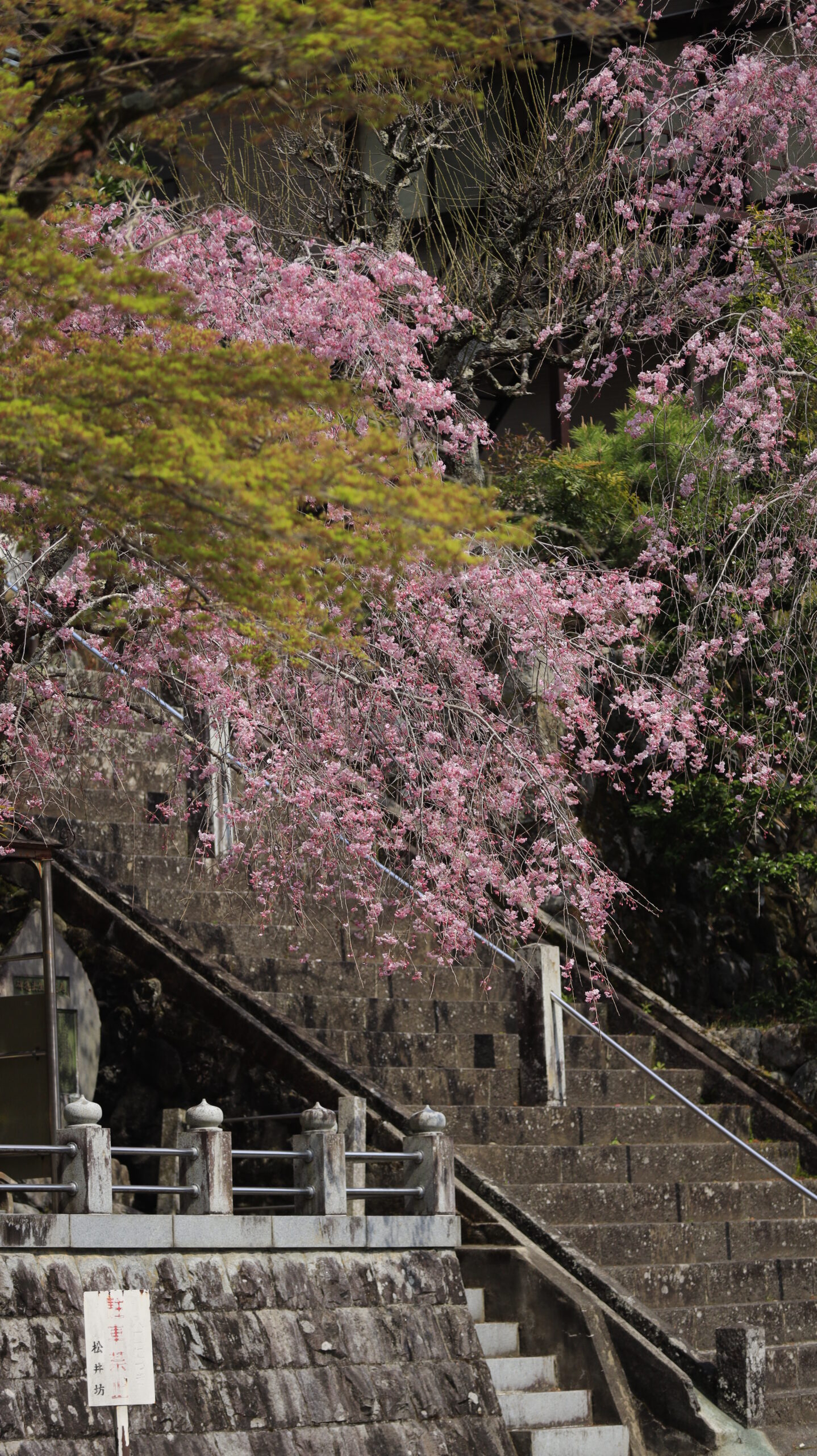 この写真は、身延山久遠寺で、下の方で見つけた美しい桜と階段の様子を撮影したもので、立体的な構図が印象的です。