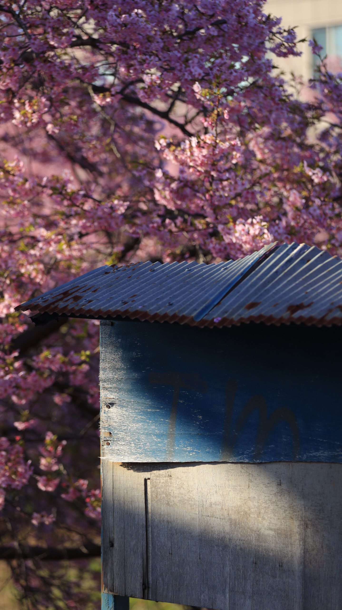 この写真は、青毛堀川で、町の掲示板と河津桜を陰と陽のバランスを意識しながら撮影したものです。