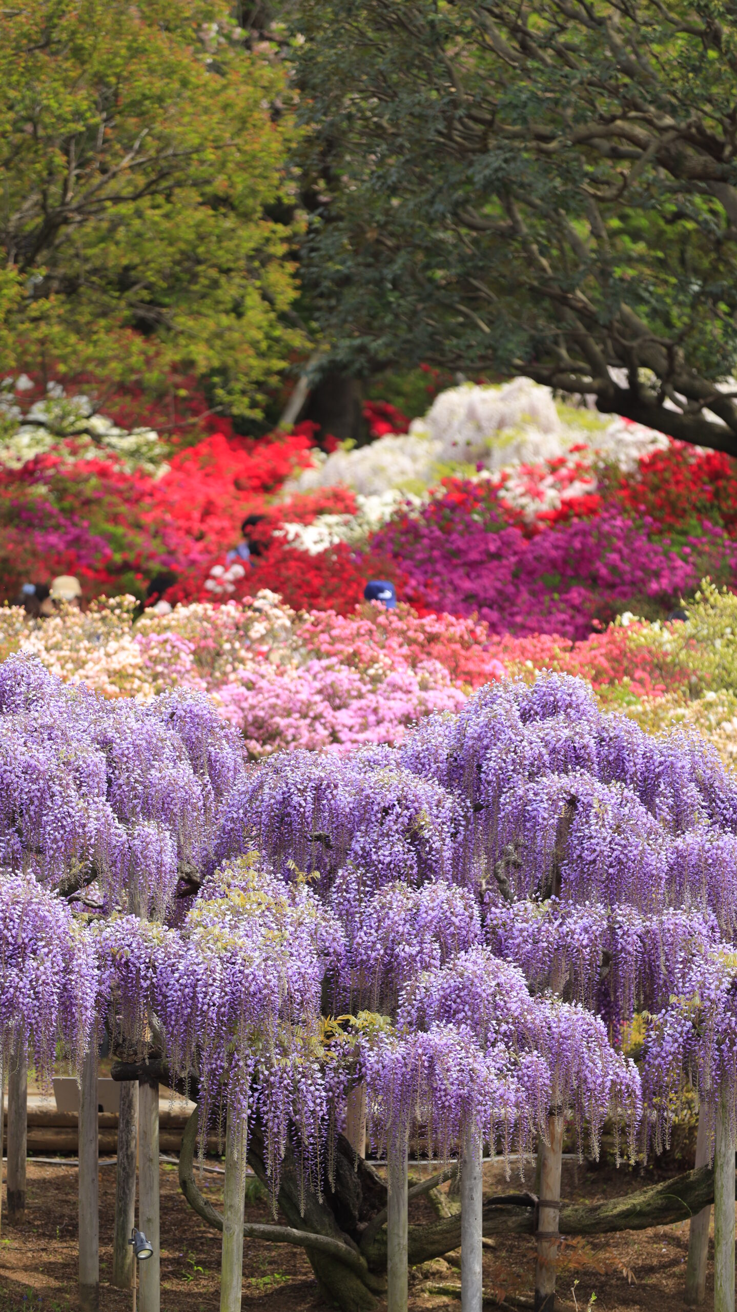 この写真は、あしかがフラワーパークで、ツツジの丘の手前にある藤の花と奥に広がるツツジを同時に収め、色の重なりと奥行きを意識して撮影したものです。