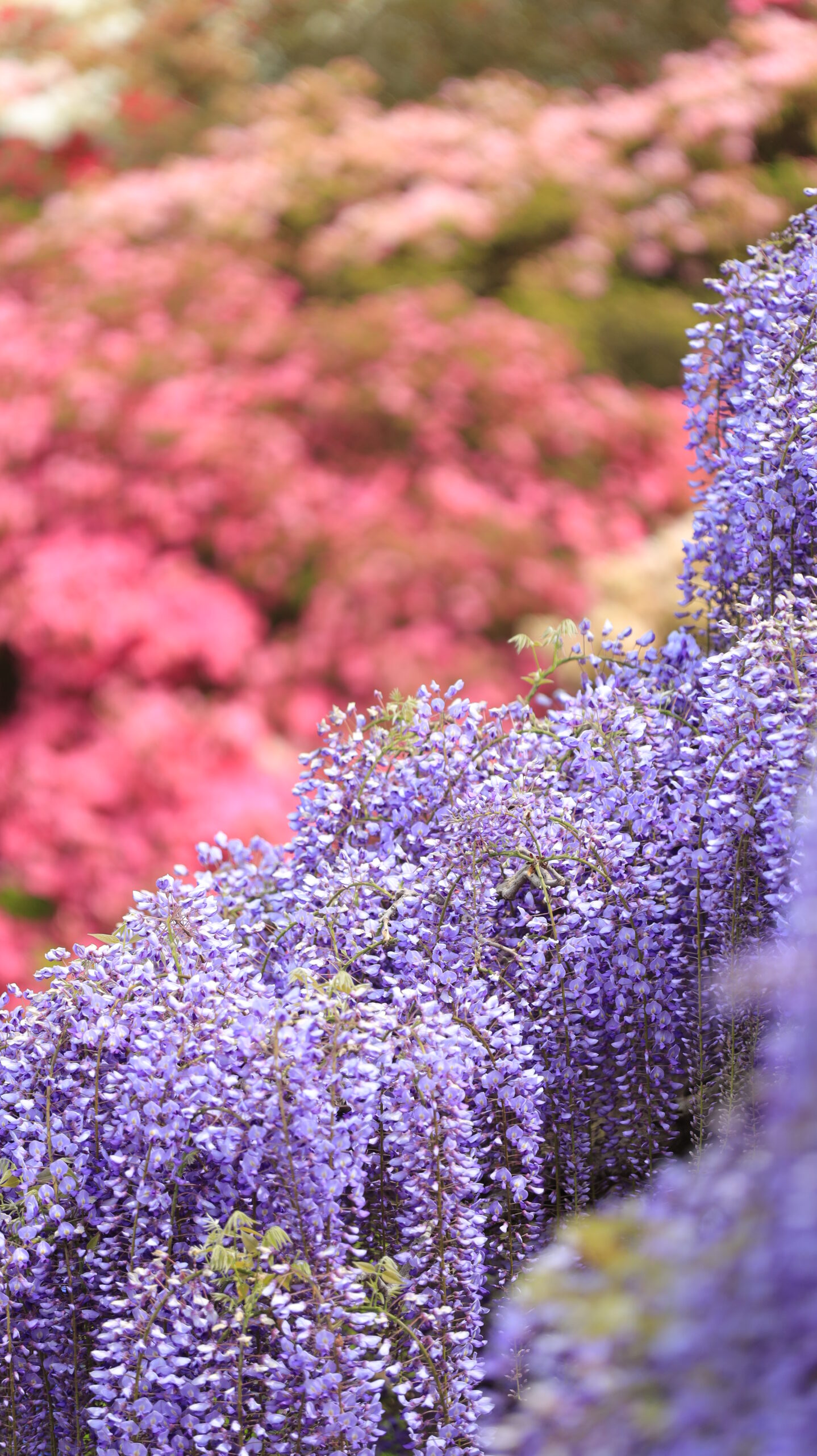 この写真は、あしかがフラワーパークで、ツツジを背景に藤の花をアップで捉え、前ボケと色の対比で印象的に仕上げた一枚です。