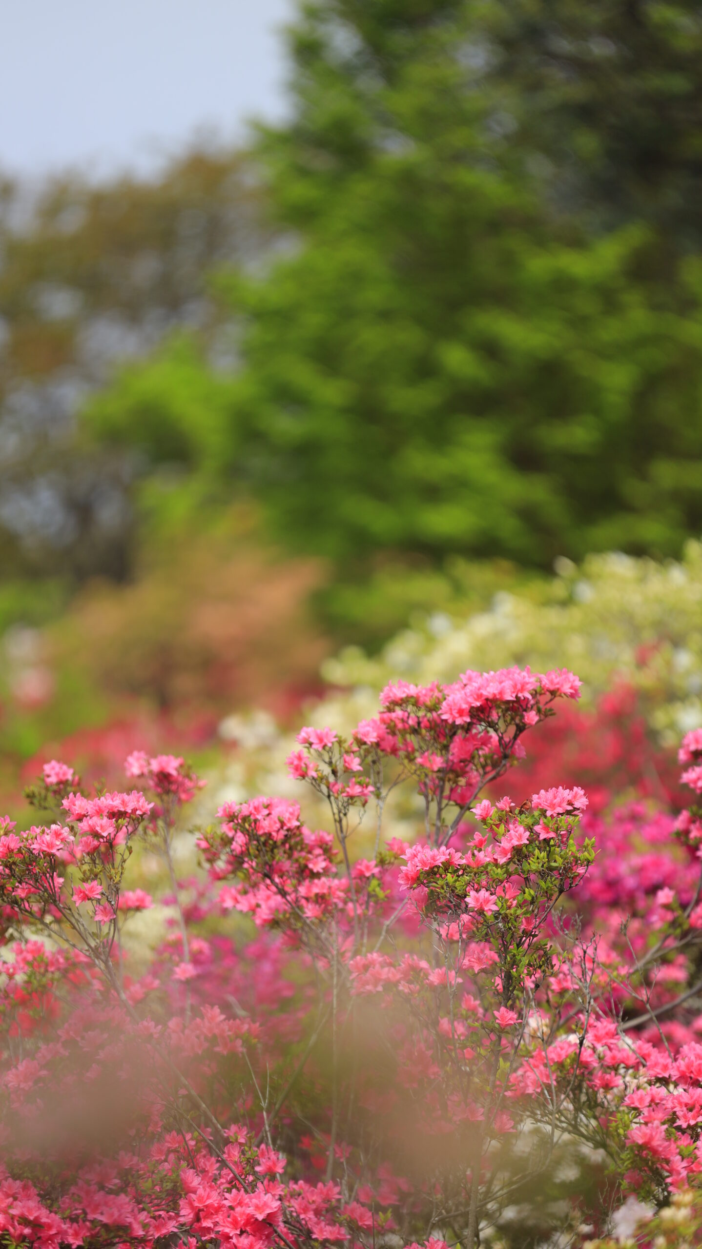 この写真は、あしかがフラワーパークで、鮮やかなツツジの花を横から捉え、花の立体感と密度を表現するように撮影したものです。