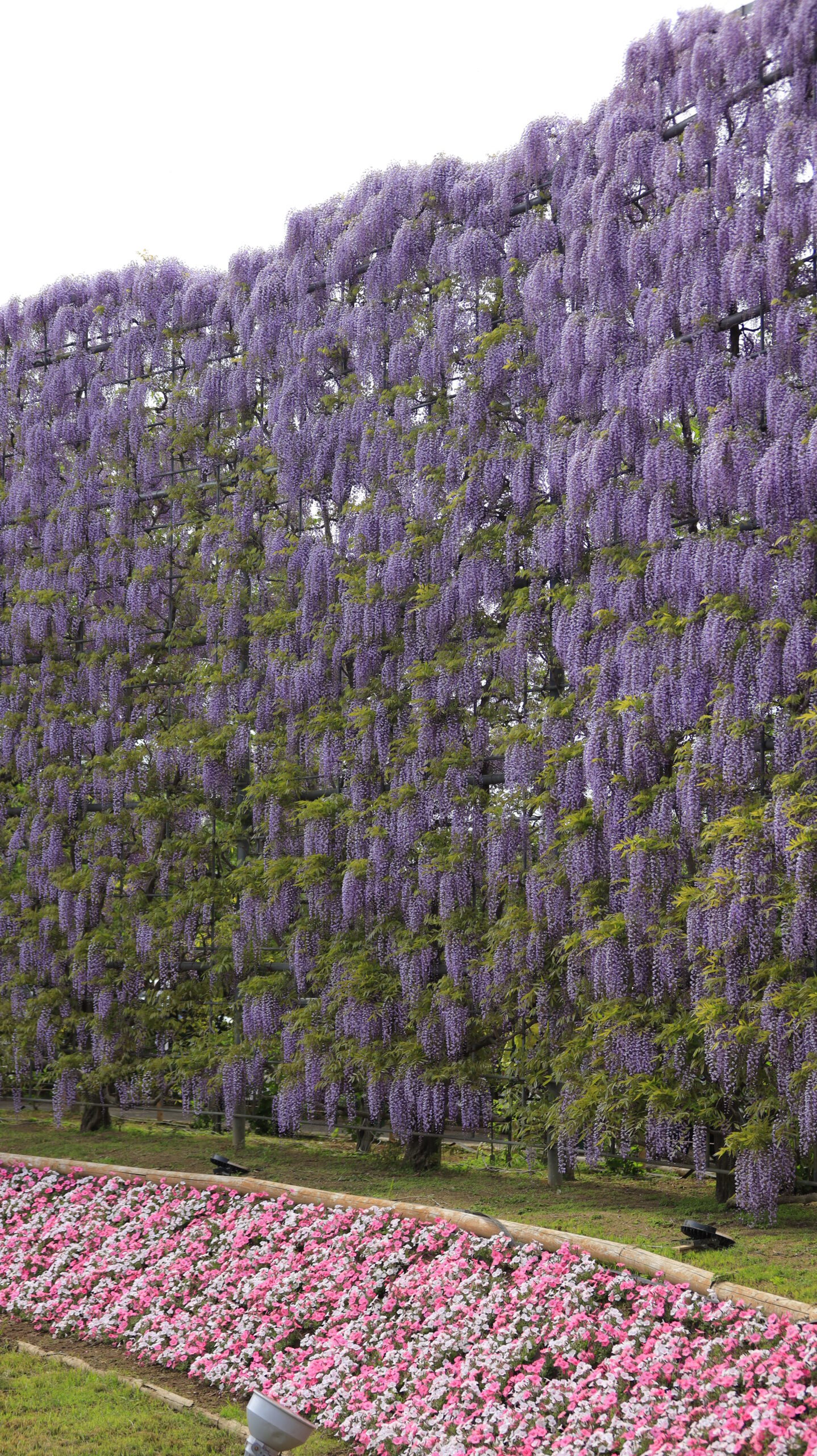 この写真は、あしかがフラワーパークで、迫力のある壁面いっぱいの藤の花を撮影し、圧倒的なボリューム感を表現したものです。