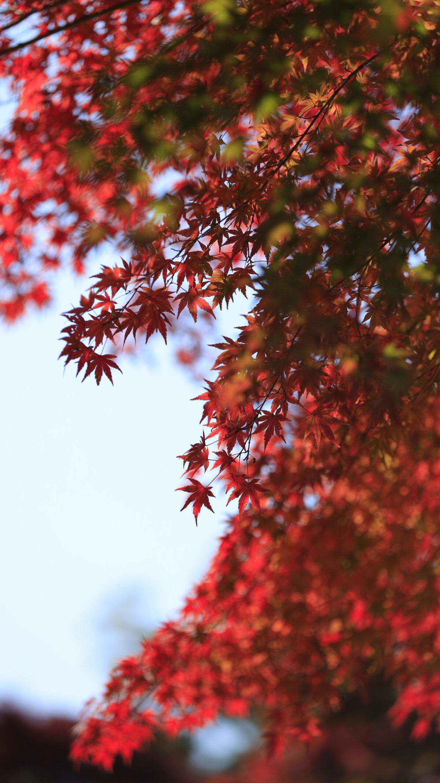 この写真は、高尾山で、光に照らされた美しい紅葉の様子を撮影したもので、葉の透け感がまるで炎のように輝いています。
