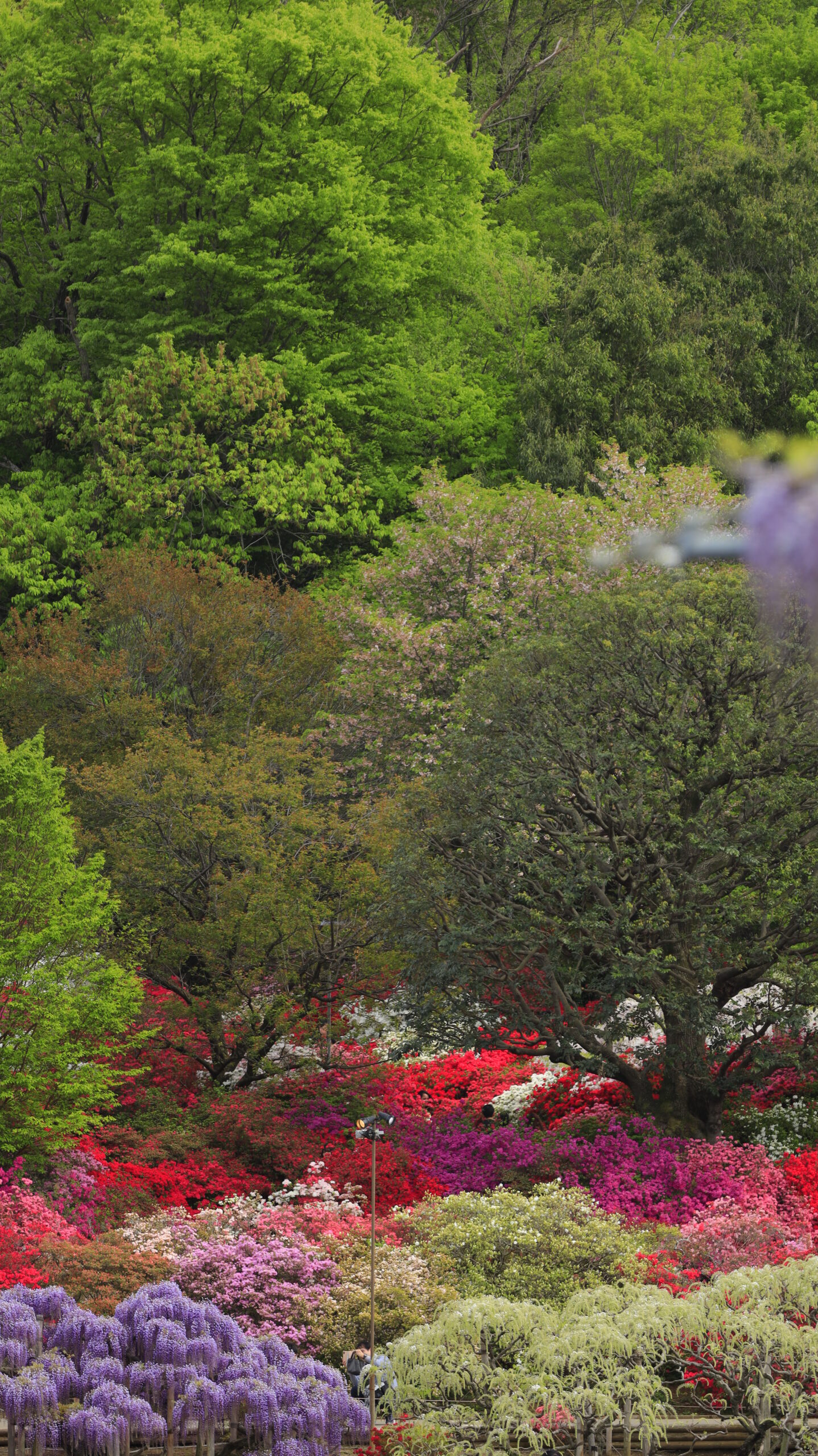 この写真は、あしかがフラワーパークで、ツツジと藤の木が広がる高台の景色を撮影し、春の色彩が重なる様子を表現したものです。