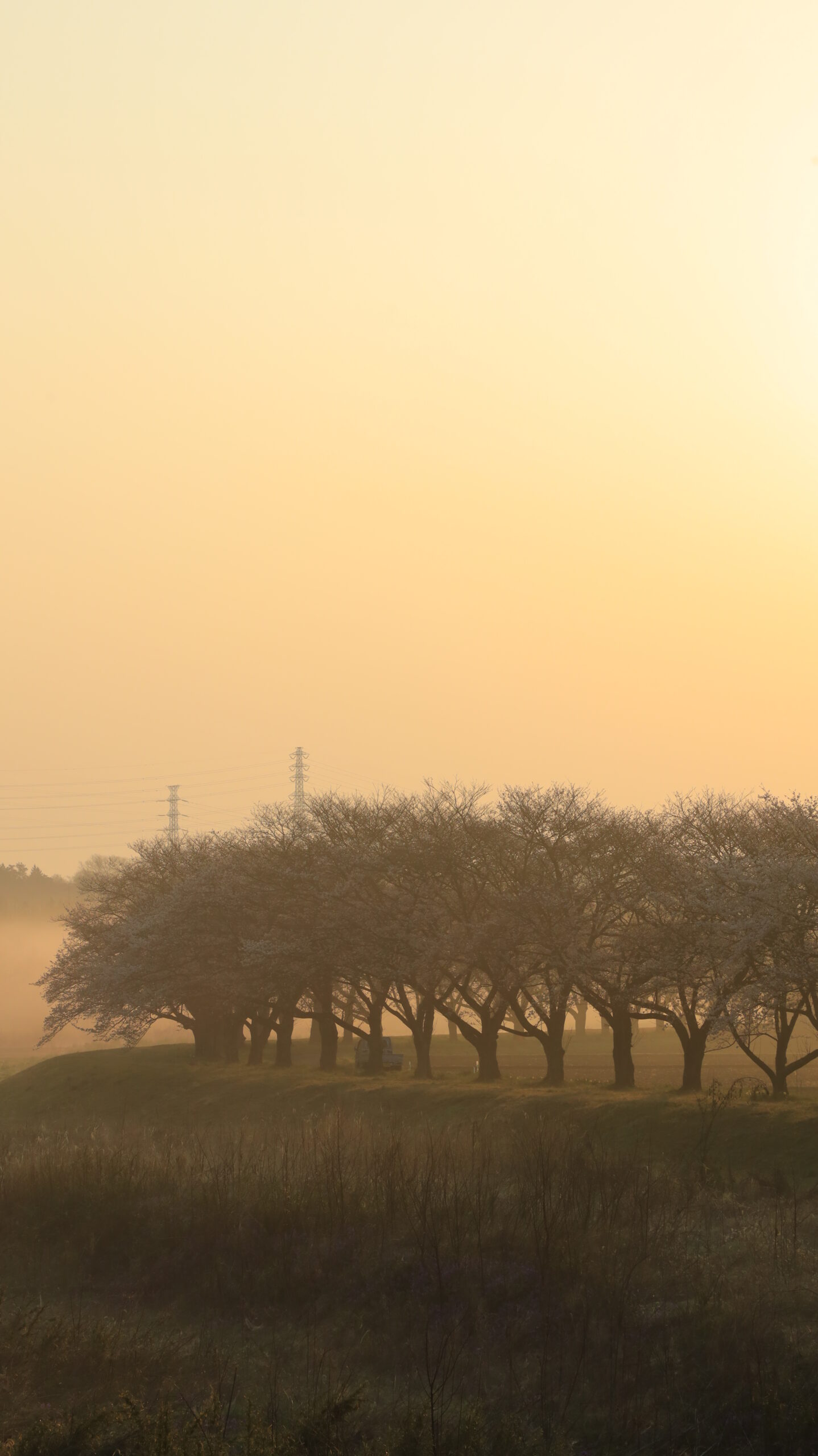 都幾川桜堤で朝靄に包まれた桜並木を静かに表現した春の風景
