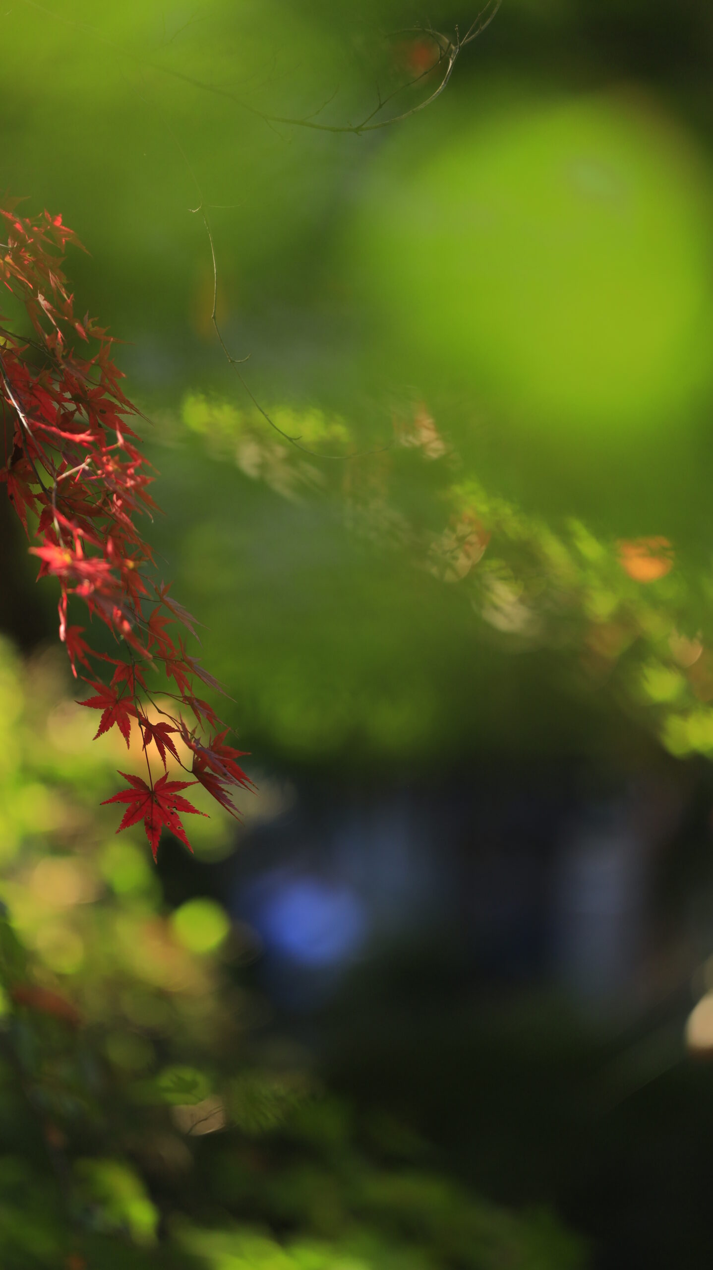 この写真は、高尾山で、青もみじの中にひときわ目立つ真っ赤なもみじを左寄せに配置して撮影したもので、構図にリズムと静寂のコントラストを感じられます。