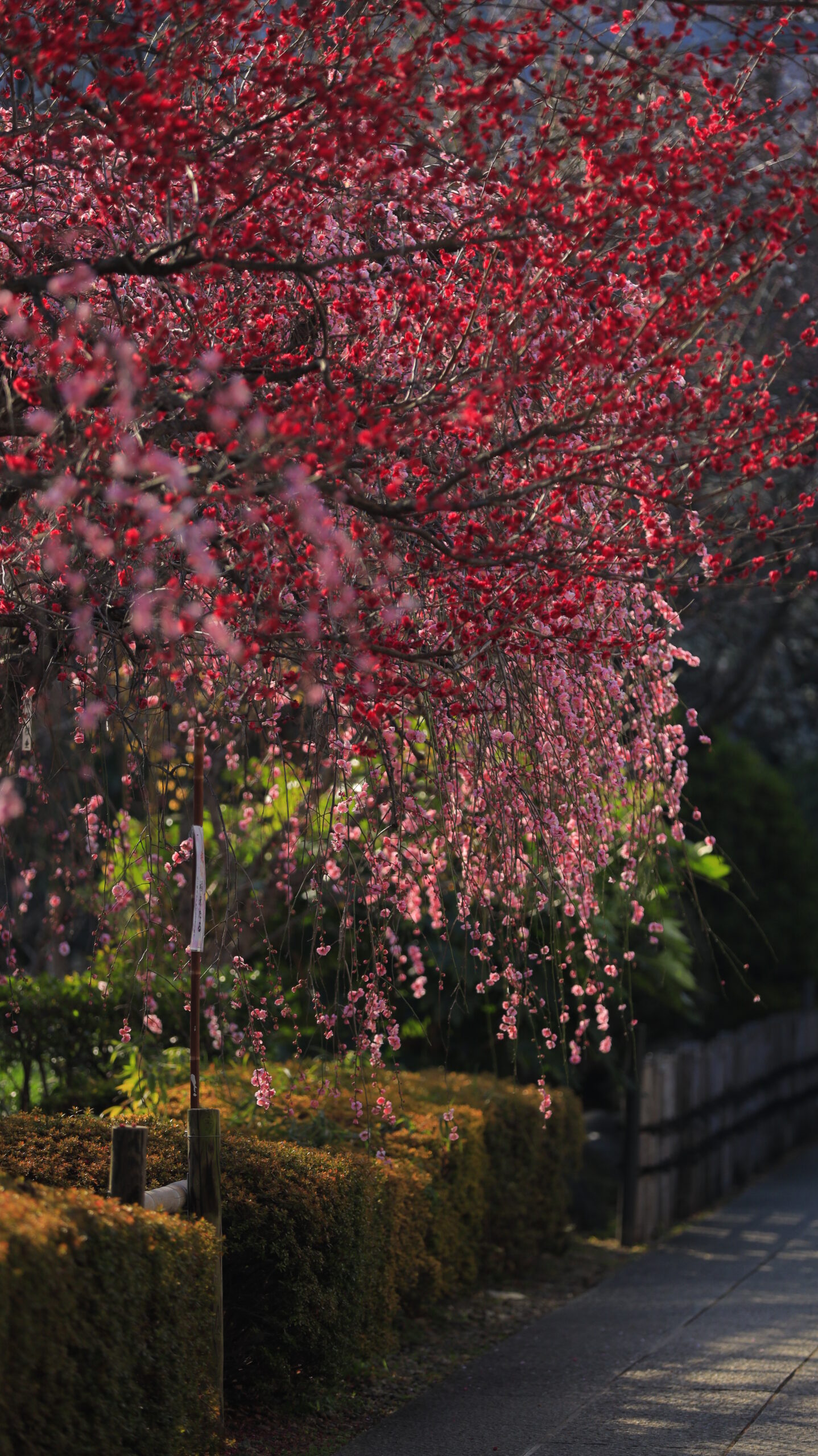 この写真は、亀戸天神で、濃いピンクの梅と奥の枝垂れ梅を斜め構図で撮影し、奥行きを意識した春景色を演出しました。