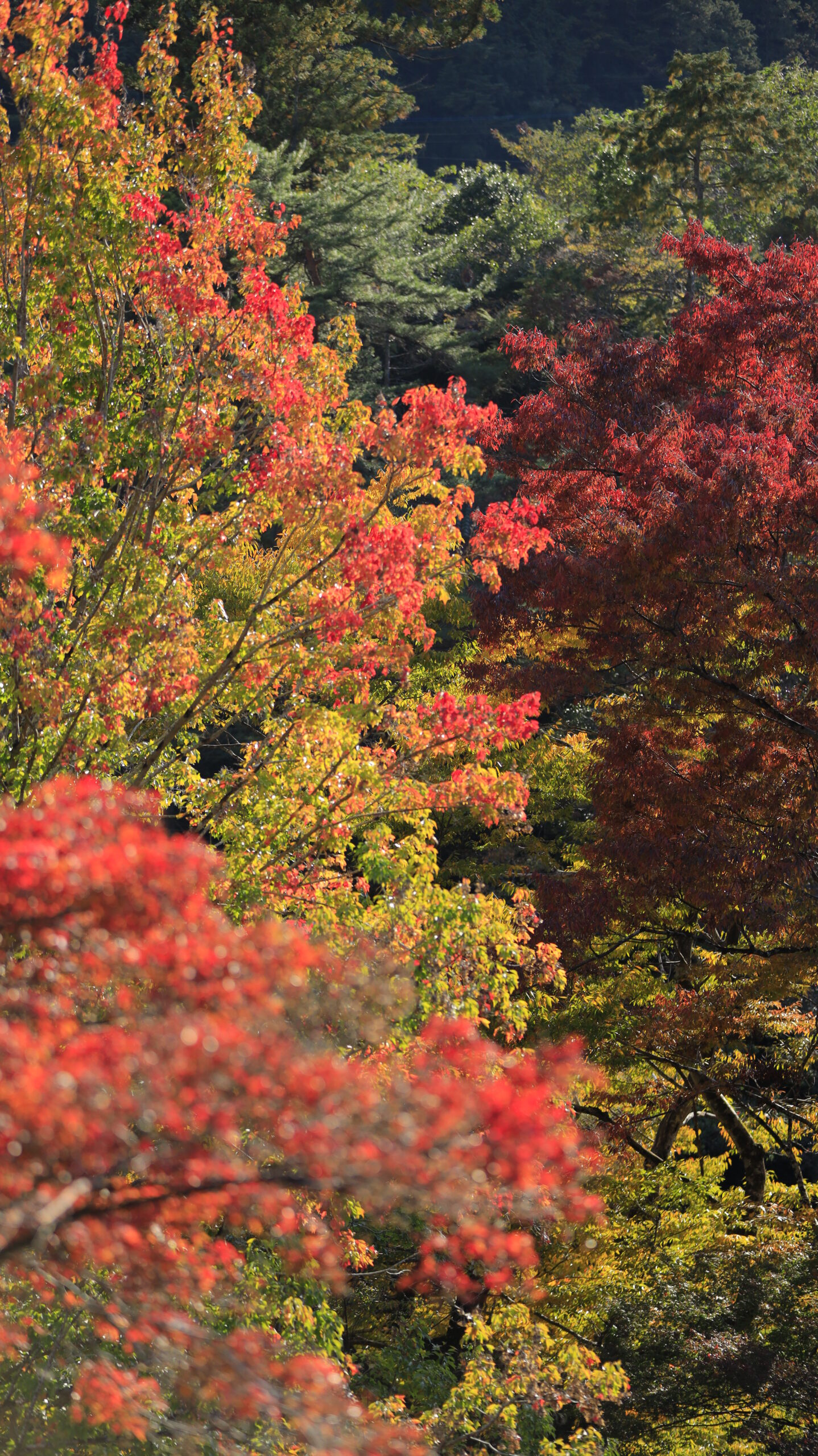 この写真は、清流ガーデン澤乃井園で、色とりどりに染まった紅葉を画面いっぱいに入れて撮影したもので、秋の華やかさをそのまま写し取ったような一枚です。