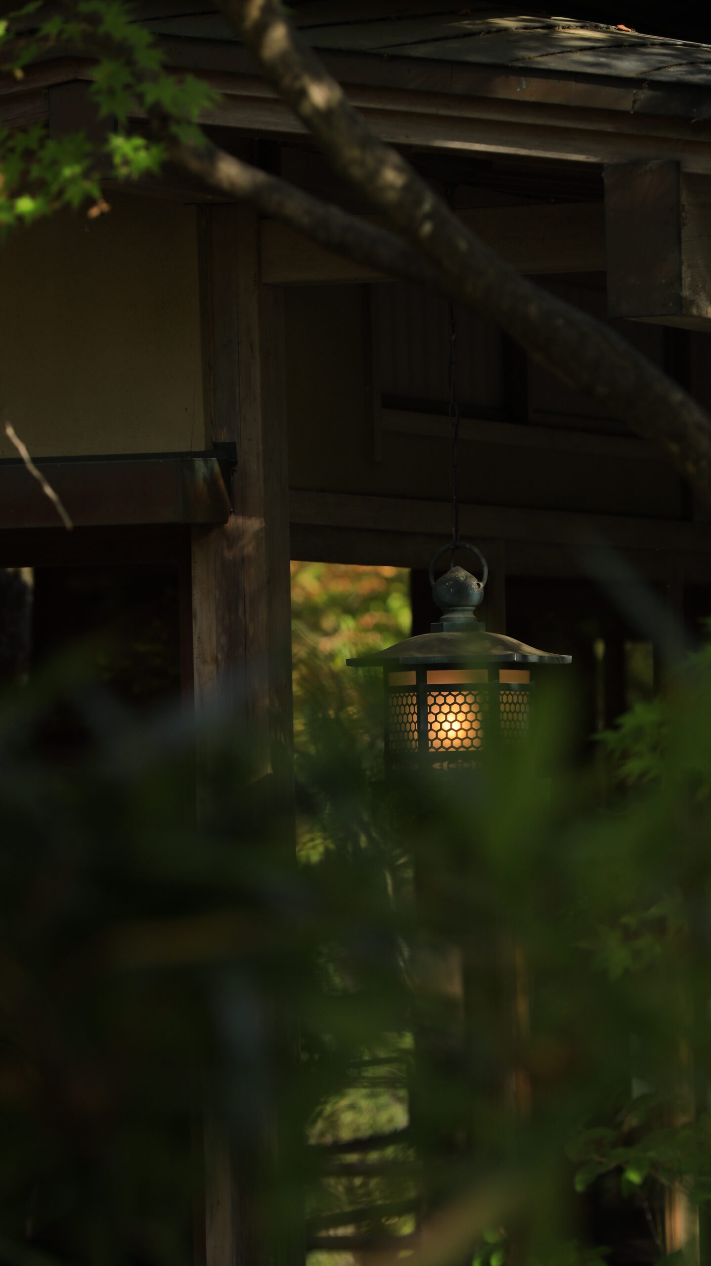 この写真は、清流ガーデン澤乃井園で、青もみじ越しに見えるランタンにピントを合わせて撮影したもので、和の灯りと自然の調和を表現しています。