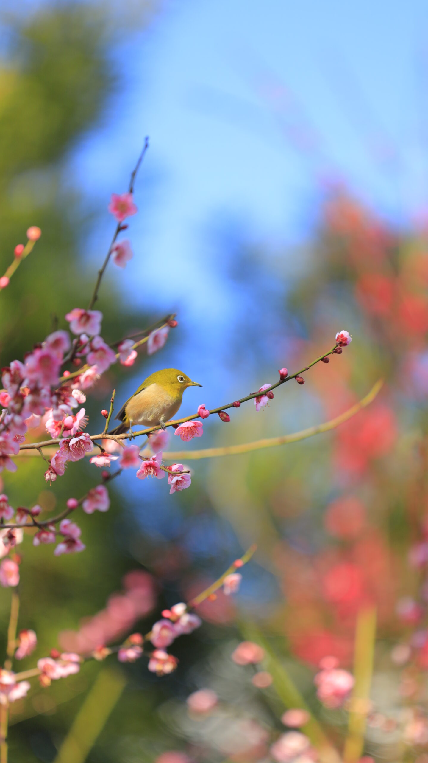 この写真は、亀戸天神で、咲く梅の枝にちょこんと座るメジロを撮影し、可愛らしい瞬間をとらえました。