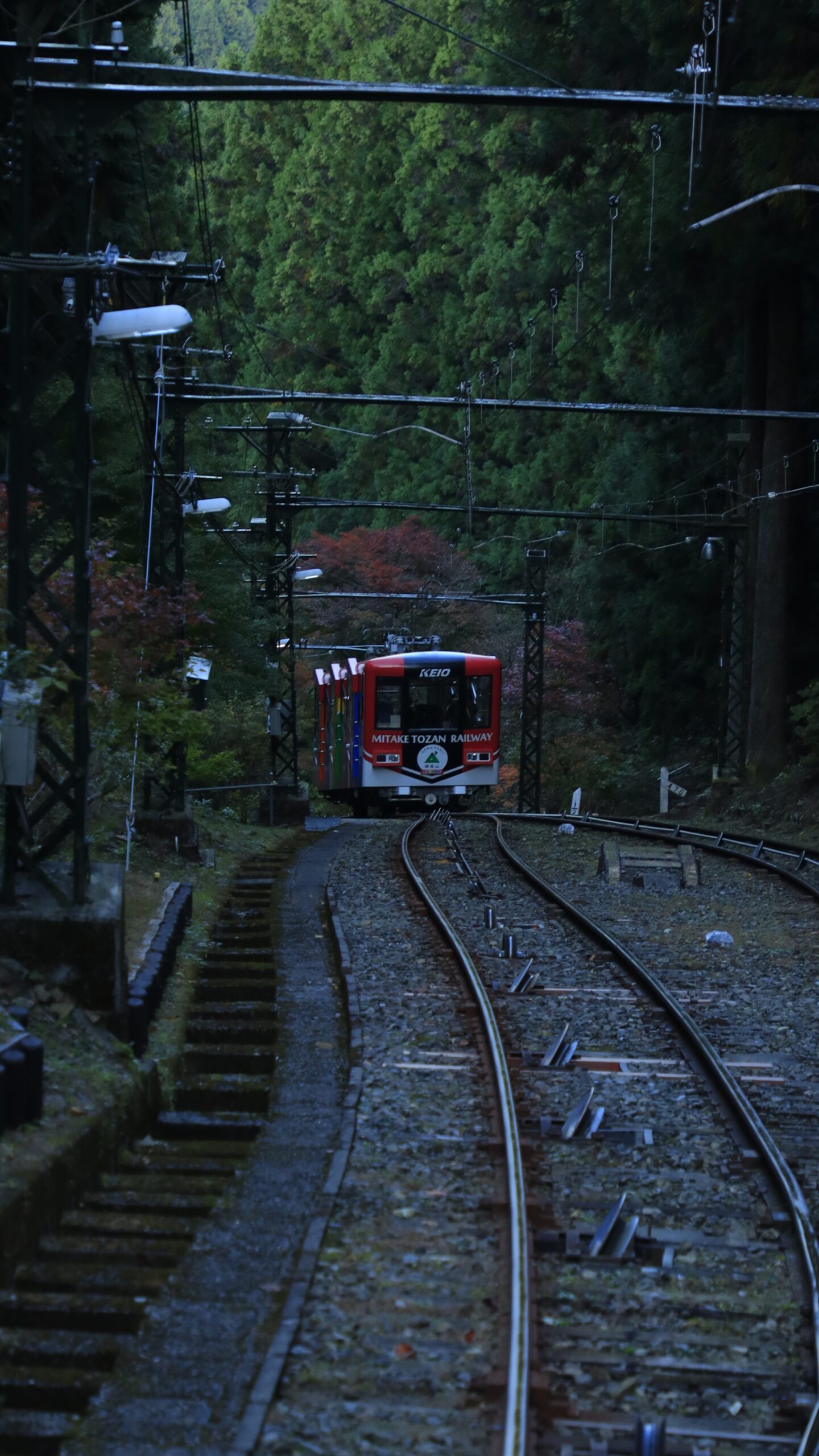 この写真は、御岳山鉄道のケーブルカーがすれ違う瞬間をとらえて撮影したもので、紅葉の中を走る車両の躍動感が伝わります。