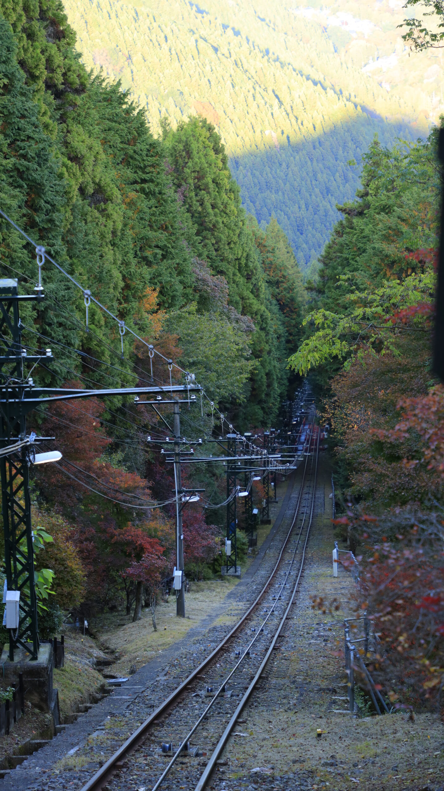 御岳山鉄道のケーブルカーの線路と紅葉を撮影し、秋の山中を走る鉄道の風情を表現した写真。