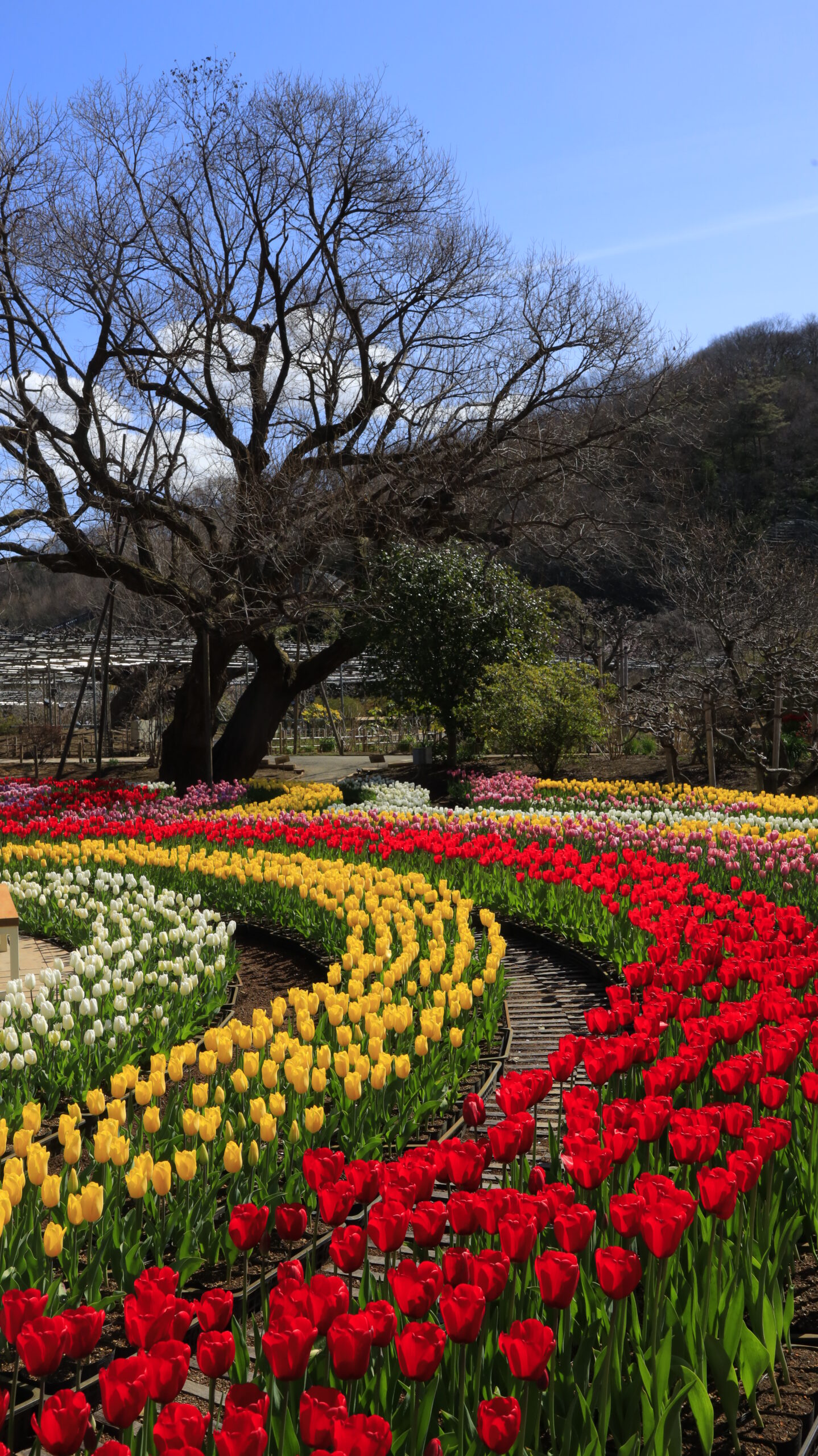 この写真は、あしかがフラワーパークで、白・黄色・赤のチューリップが曲線を描くように並ぶ花壇を撮影し、色彩とラインの美しさが印象的に伝わるように撮影したものです。