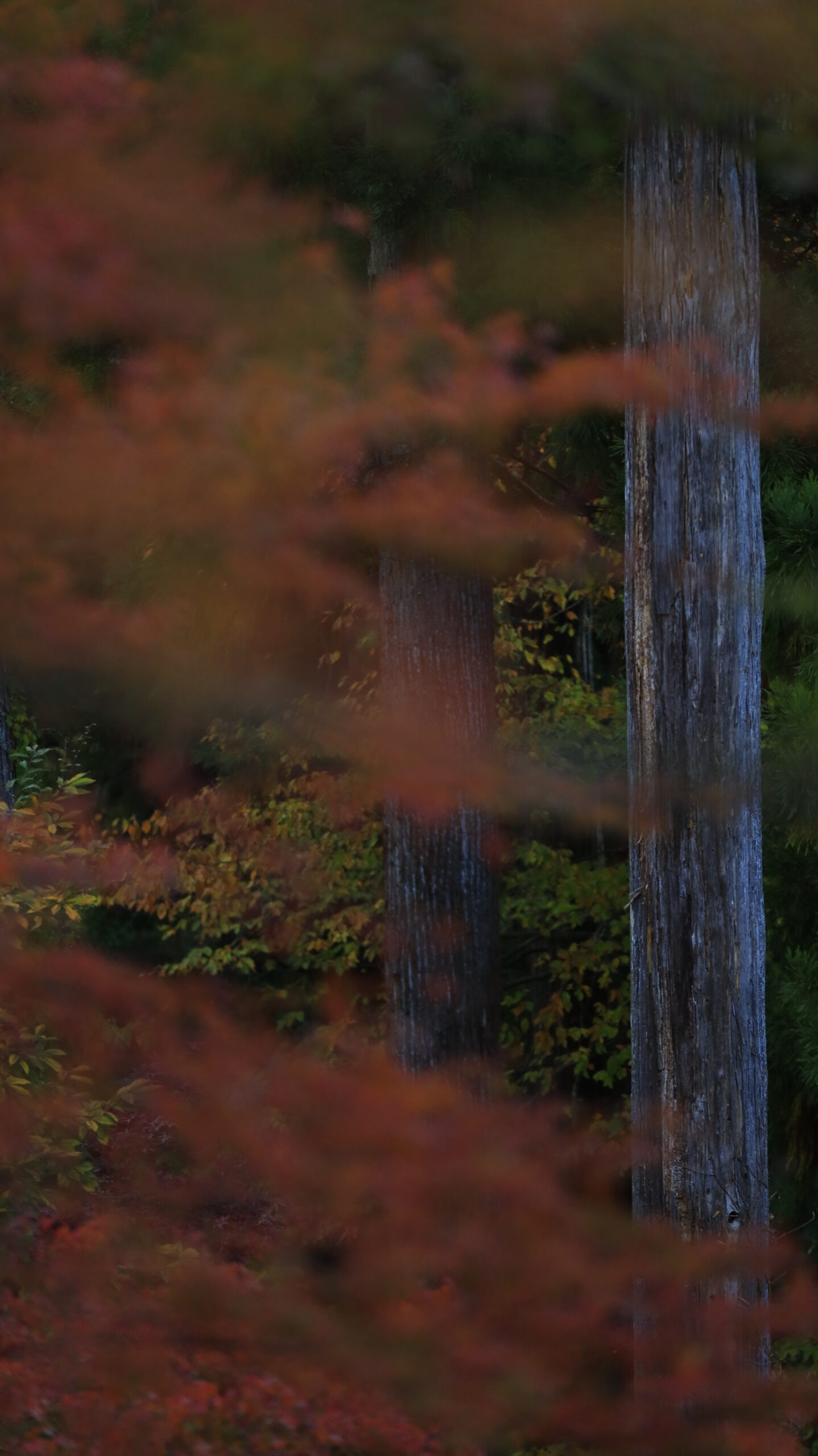 この写真は、御岳山で、紅葉の葉を前ボケにして奥に立つ杉の木に焦点を合わせたもので、奥行きと温かみのある構図に仕上げています。