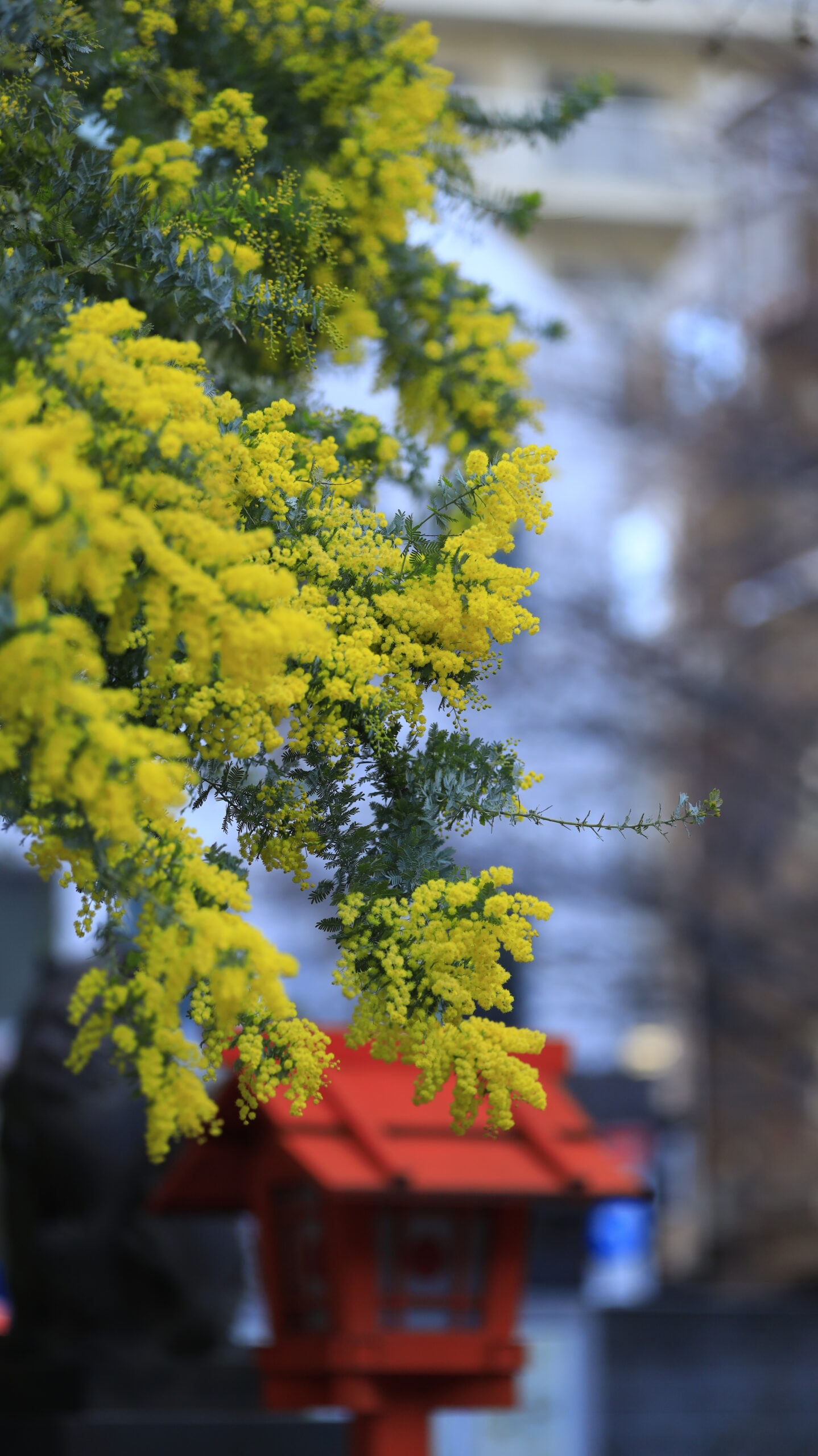 この写真は、蔵前神社で、ミモザをややアップにし灯籠とあわせて撮影し、奥行きある構図に仕上げました。