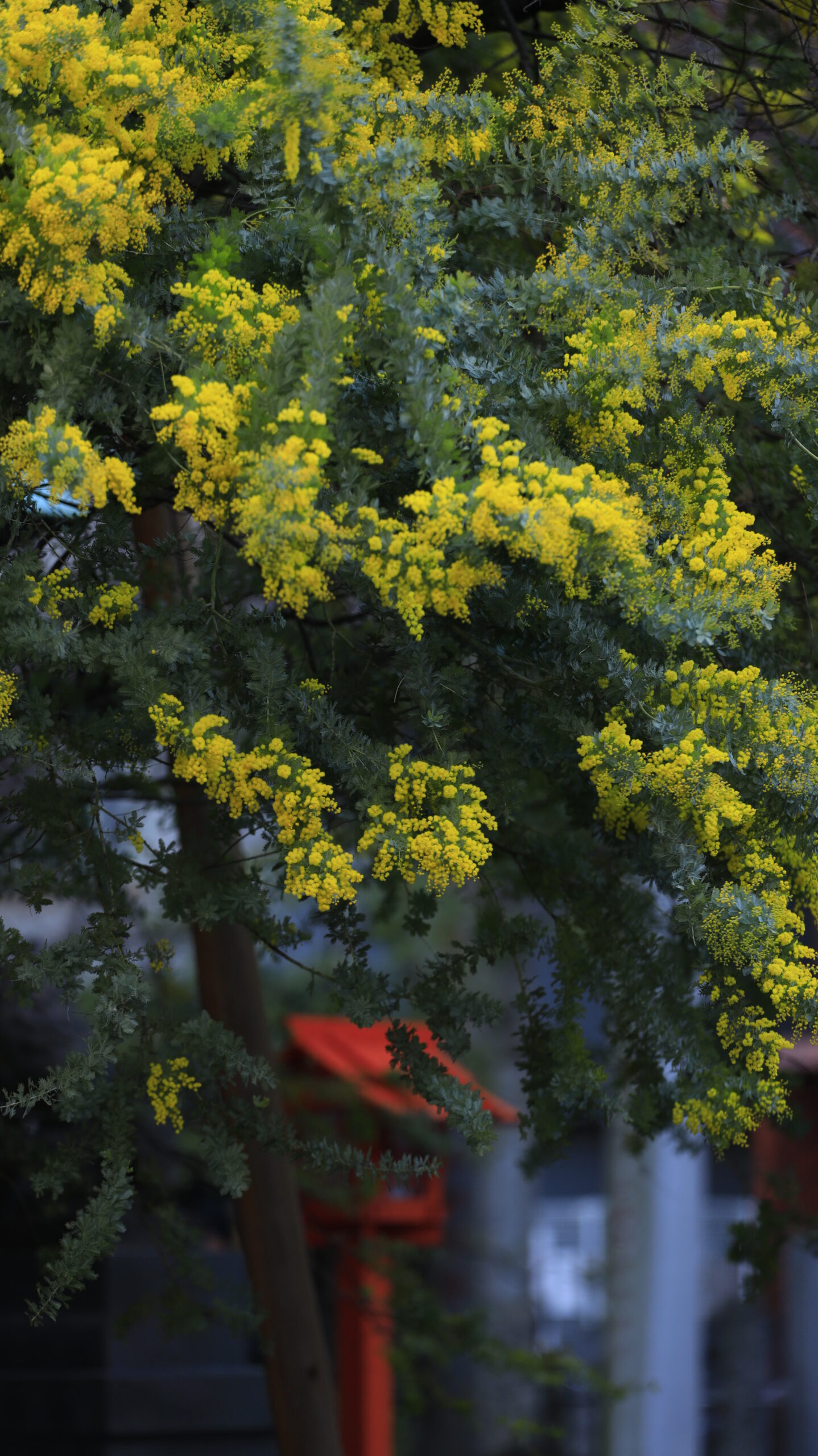 この写真は、蔵前神社で、ミモザと灯籠の配置を意識し少し暗めに撮影し、しっとりとした雰囲気を表現しました。